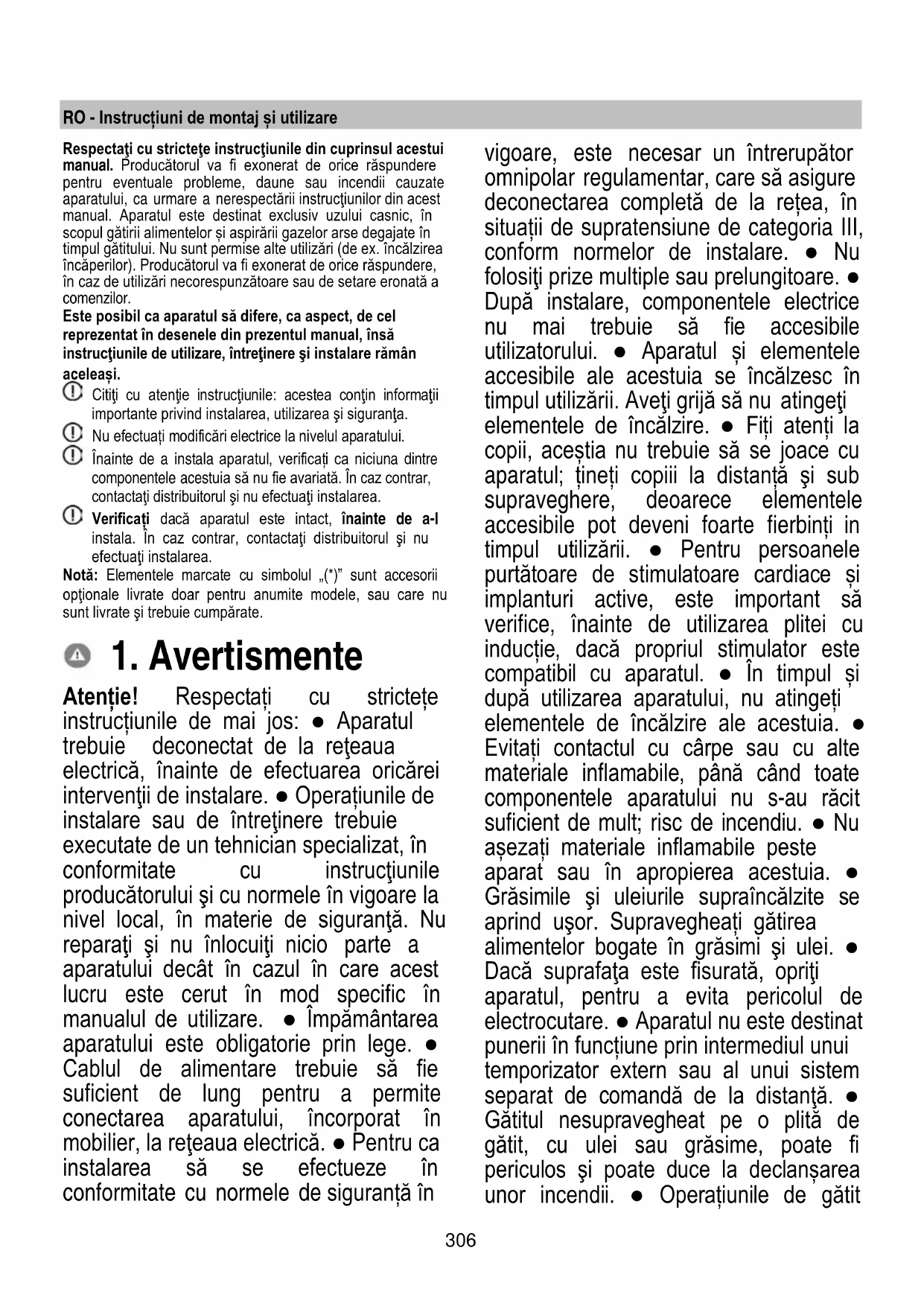 Преди да се свържете със сервиза за техническо обслужване: 1.Уверете се, че не сте в състояние да разрешите сами проблема на базата на информацията, поместена в раздела „Установяване на повреди”. 2.Изключете и включете отново уреда, за да се уверите, че неизправността е отстранена. Ако след въпросните проверки неизправността е все още налице, свържете се с най-близкия сервиз за техническо обслужване.306 RO - Instrucțiuni de montaj și utilizare Respectaţi cu stricteţe instrucţiunile din cuprinsul acestui manual. Producătorul va fi exonerat de orice răspundere pentru eventuale probleme, daune sau incendii cauzate aparatului, ca urmare a nerespectării instrucţiunilor din acest manual. Aparatul este destinat exclusiv uzului casnic, în scopul gătirii alimentelor și aspirării gazelor arse degajate în timpul gătitului. Nu sunt permise alte utilizări (de ex. încălzirea încăperilor). Producătorul va fi exonerat de orice răspundere, în caz de utilizări necorespunzătoare sau de setare eronată a comenzilor. Este posibil ca aparatul să difere, ca aspect, de cel reprezentat în desenele din prezentul manual, însă instrucţiunile de utilizare, întreţinere şi instalare rămân aceleași. Citiţi cu atenţie instrucţiunile: acestea conţin informaţii importante privind instalarea, utilizarea şi siguranţa. Nu efectuați modificări electrice la nivelul aparatului. Înainte de a instala aparatul, verificați ca niciuna dintre componentele acestuia să nu fie avariată. În caz contrar, contactaţi distribuitorul şi nu efectuaţi instalarea. Verificați dacă aparatul este intact, înainte de a-l instala. În caz contrar, contactaţi distribuitorul şi nu efectuaţi instalarea. Notă: Elementele marcate cu simbolul „(*)” sunt accesorii opţionale livrate doar pentru anumite modele, sau care nu sunt livrate şi trebuie cumpărate.