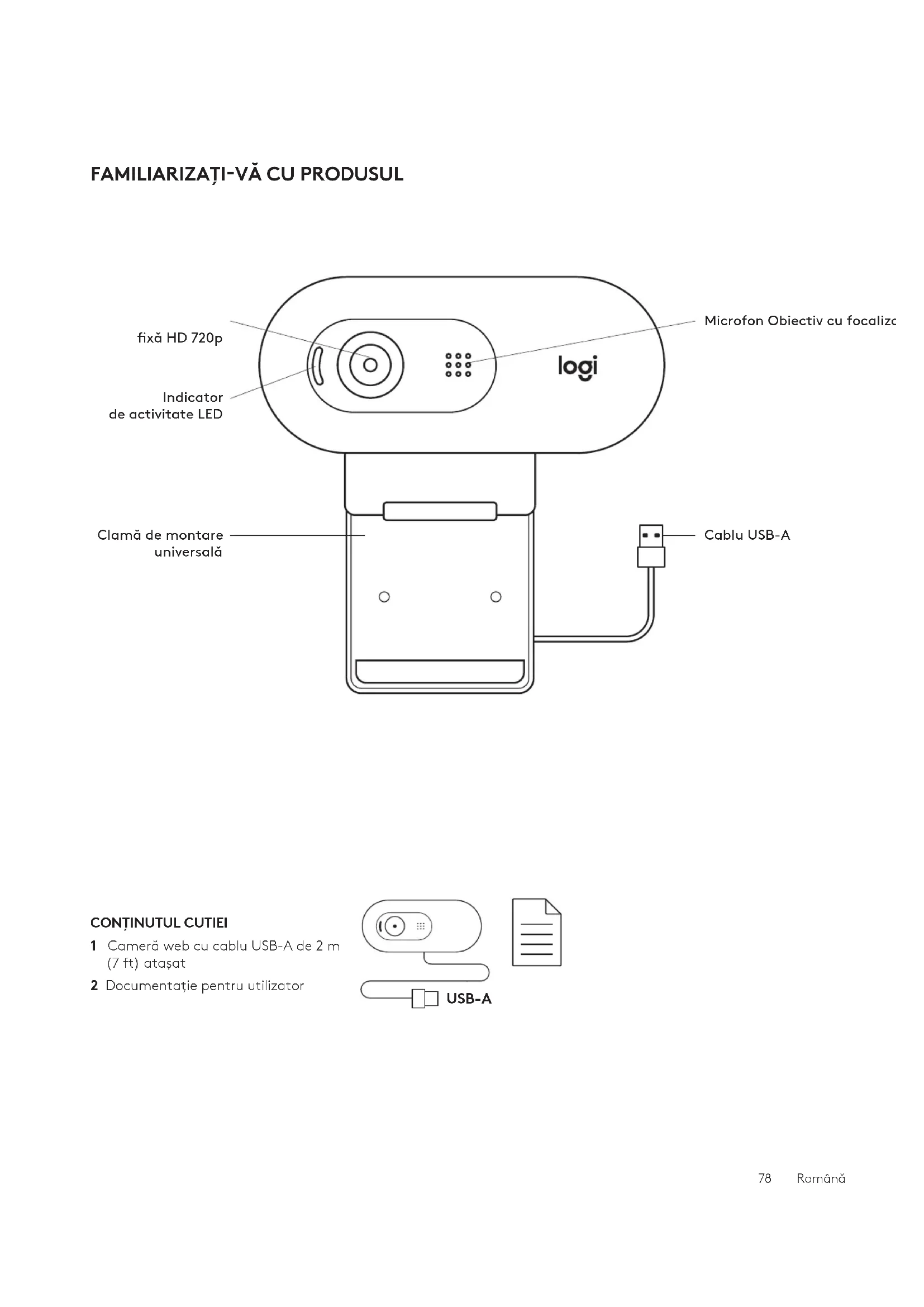Indicatorul de activitate LED se va aprinde când camera web este utilizată de o aplicaie. 2 Reglai camera pentru a vă asigura că terminaia clamei de montare universale este aliniat la partea dinspate a dispozitivului dvs. 3 Reglai manual camera web în sus/jos în cea mai bună poziie pentru a vă încadra. 79 RomânăINCLUSIV CLAMA DE MONTARE FIXĂ: Înălime x lăime x adâncime: 31,91 mm (1,26 in) x 72,91 mm (2,87 in) x 66,64 mm (2,62 in) Greutate: 75 g (2,65 oz) DIMENSIUNI www.logitech.com/support/C505e © 2020 Logitech, Logi şi sigla Logitech sunt mărci comerciale sau mărci comerciale înregistrate ale Logitech Europe S.A. şi/sau ale aliaţilor săi în S.U.A. şi în alte ţări. Logitech nu îşi asumă responsabilitatea pentru nicio eroare care este posibil să apară în acest manual. Informaţiilecuprinse în acest document se pot modica fără noticare.USB-A Mikrofon Sabit odaklı HD720p mercek LED etkinlik ışığı Evrensel takma klipsi USB-A kablo
