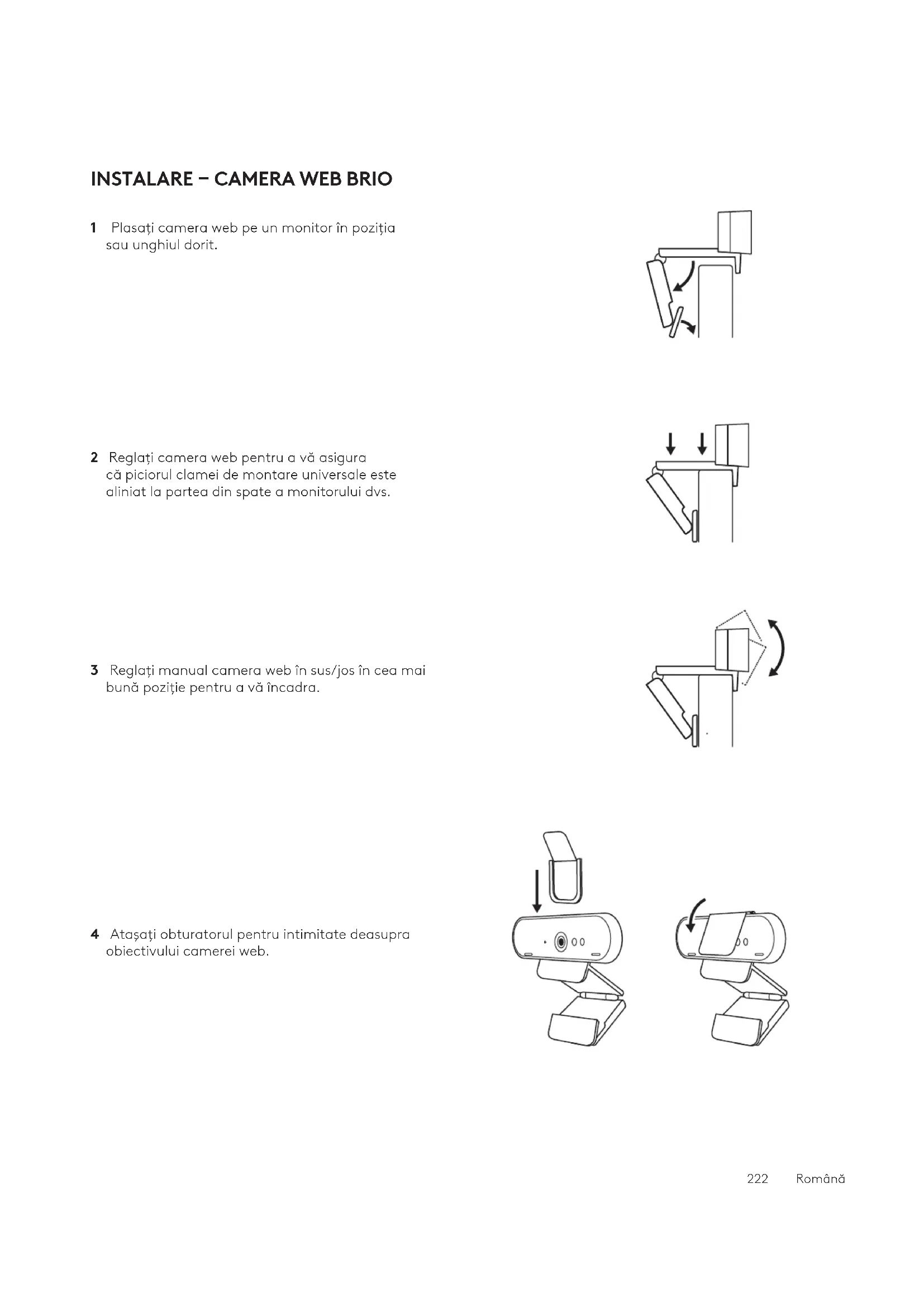 221 RomânăINSTALARE – CAMERA WEB BRIO 1 Plasai camera web pe un monitor în poziia sauunghiul dorit. 2 Reglai camera web pentru a vă asigura căpiciorul clamei de montare universale este aliniat la partea din spate a monitorului dvs. 3 Reglai manual camera web în sus/jos în cea mai bună poziie pentru a vă încadra. 4 Ataai obturatorul pentru intimitate deasupra obiectivului camerei web. 222RomânăINSTALARE – CABLU USB-C CU KIT DE PRINDERE PENTRU ORDONARE 1 Curăai suprafaa. Îndepărtai banda adezivă. 2 Împingei cu foră bucla de prindere în masă, timp de câteva secunde. 223RomânăINSTALARE – OPŢIUNI DE MONTARE Opţiunea 1 Fixai Logi Dock de masă cu ajutorul celor 2 uruburi incluse. Opţiunea 2 Fixai Logi Dock de masă cu banda adezivă VHB lipind partea de jos asuportului de montare. Opţiunea 3 Fixai Logi Dock de masă cu dispozitivul de sigurană Kensington.* *Dispozitivul de sigurană nu este inclus 224RomânăINSTALARE – GESTIONAREA CABLURILOR 1 Îndepărtai clema, folosind cheia hexagonală inclusă. Apoi, ridicai i îndepărtai partea superioară i pe cea mijlocie a suportului. 2 Instalai toate cablurile, e în partea desus, e în cea de jos a suportului, în funcie depoziionarea conectorilor. 3 Punei la loc clema. Strângei uruburile pentru a xa cablurile. 225RomânăVERSIUNEA UC 1x 1x2 sec. 2 sec.