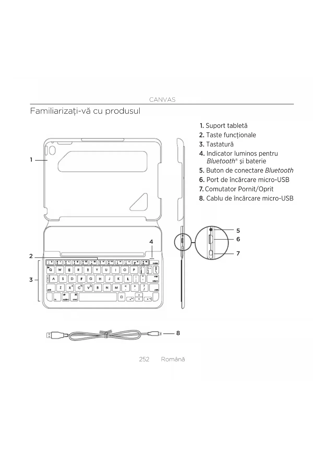 257 Română Indicatoarele luminoase de stare Indicatorul luminos de stare al carcasei pentru tastatură furnizează informaţii desprealimentarea bateriei şi despre conexiunea Bluetooth: Indicator luminos Descriere Verde Bateria este încărcată adecvat. Roşu Nivelul de încărcare a bateriei este redus (mai puţin de 10%). Reîncărcaţi bateria. Albastru intermitent Rapid: Tastatura este în modul descoperire, pregătită pentru asociere. Lent: Tastatura încearcă să se reconecteze la dispozitivul iPad. Albastru constant Asocierea sau reconectarea Bluetooth s-a efectuat cu succes.CANVAS 258 Română Taste funcţionale Fn + 1 = Ecran de blocare Blochează sau deblochează ecranul iPad mini Fn + 2 = Siri Utilizaţi vocea pentru a trimite mesaje, pentru a efectua apeluri, pentru a programa întâlniri şimaimulte Fn + 3 = Căutare Lansează funcţia de căutare aiPadmini Fn + 4 = Comutare limbă Comută limba tastaturii Fn + 5 = Tastatură virtuală Afişează/ascunde tastatura virtuală Fn + 6 = Captură de ecran Fn + 7 = Piesa anterioară Fn + 8 = Redare/Pauză Fn + 9 = Piesa următoare Fn + 0 = Anulare volum Fn + Cratimă = Scădere volum Fn + Plus = Creştere volum Ecran iniţial = ecranul iniţial aldispozitivului iPad mini Afişează ecranul iniţial al iPad mini Fn + X = Tăiere Fn + C = Copiere Fn + V = Lipire Fn + Cursor stânga = Selecţie stânga Selectează textul la stânga, cuvântcucuvânt Fn + Cursor dreapta = Selecţiedreapta Selectează textul la dreapta, cuvântcu cuvânt Fn + Bara de spaţiu = Comutareaplicaţii Notă: Pentru a selecta o tastă funcţională, apăsaţi lung tasta Fn, apoi apăsaţi tasta indicată mai sus.CANVAS 259 Română Încărcarea bateriei tastaturii Dacă indicatorul luminos de stare al bateriei este roşu, bateria carcasei pentru tastatură trebuie încărcată.
