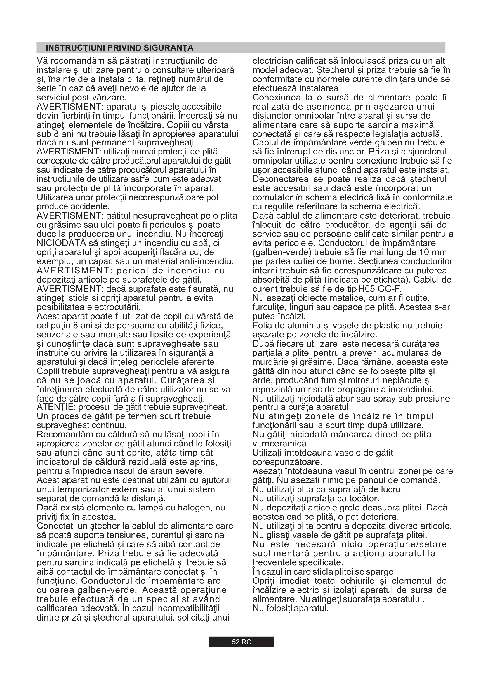 Vă recomandăm să păstraţi instrucţiunile de instalare şi utilizare pentru o consultare ulterioară şi, înainte de a instala plita, reţineţi numărul de serie în caz că aveţi nevoie de ajutor de la serviciul post-vânzare. AVERTISMENT: aparatul şi piesele accesibile devin fierbinţi în timpul funcţionării. Încercaţi să nu atingeţi elementele de încălzire. Copiii cu vârsta sub 8 ani nu trebuie lăsaţi în apropierea aparatului dacă nu sunt permanent supravegheaţi. AVERTISMENT: utiliza¸i numai protec¸ii de plită concepute de către producătorul aparatului de gătit sau indicate de către producătorul aparatului în instruc¸iunile de utilizare astfel cum este adecvat sau protec¸ii de plită încorporate în aparat. Utilizarea unor protec¸ii necorespunzătoare pot produce accidente. AVERTISMENT: gătitul nesupravegheat pe o plită cu grăsime sau ulei poate fi periculos şi poate duce la producerea unui incendiu. Nu încercaţi NICIODATĂ să stingeţi un incendiu cu apă, ci opriţi aparatul şi apoi acoperiţi flacăra cu, de exemplu, un capac sau un material anti-incendiu. AVERTISMENT: pericol de incendiu: nu depozitaţi articole pe suprafeţele de gătit. AVERTISMENT: dacă suprafaţa este fisurată, nu atinge¸i sticla și opriţi aparatul pentru a evita posibilitatea electrocutării. ATEN¾IE: procesul de gătit trebuie supravegheat. Un proces de gătit pe termen scurt trebuie supravegheat continuu. Recomandăm cu căldură să nu lăsaţi copiii în apropierea zonelor de gătit atunci când le folosiţi sau atunci când sunt oprite, atâta timp cât indicatorul de căldură reziduală este aprins, pentru a împiedica riscul de arsuri severe. Acest aparat nu este destinat utilizării cu ajutorul unui temporizator extern sau al unui sistem separat de comandă la distanţă. Dacă există elemente cu lampă cu halogen, nu priviţi fix în acestea. Acest aparat poate fi utilizat de copii cu vârstă de cel puţin 8 ani şi de persoane cu abilităţi fizice, senzoriale sau mentale sau lipsite de experienţă şi cunoştinţe dacă sunt supravegheate sau instruite cu privire la utilizarea în siguranţă a aparatului şi dacă înţeleg pericolele aferente. Copiii trebuie supravegheaţi pentru a vă asigura că nu se joacă cu aparatul. Curăţarea şi întreţinerea efectuată de către utilizator nu se va face de către copii fără a fi supravegheaţi. Conecta¸i un ștecher la cablul de alimentare care să poată suporta tensiunea, curentul și sarcina indicate pe etichetă și care să aibă contact de împământare. Priza trebuie să fie adecvată pentru sarcina indicată pe etichetă și trebuie să aibă contactul de împământare conectat și în func¸iune. Conductorul de împământare are culoarea galben-verde. Această operaţiune trebuie efectuată de un specialist având calificarea adecvată. În cazul incompatibilităţii dintre priză şi ştecherul aparatului, solicitaţi unui