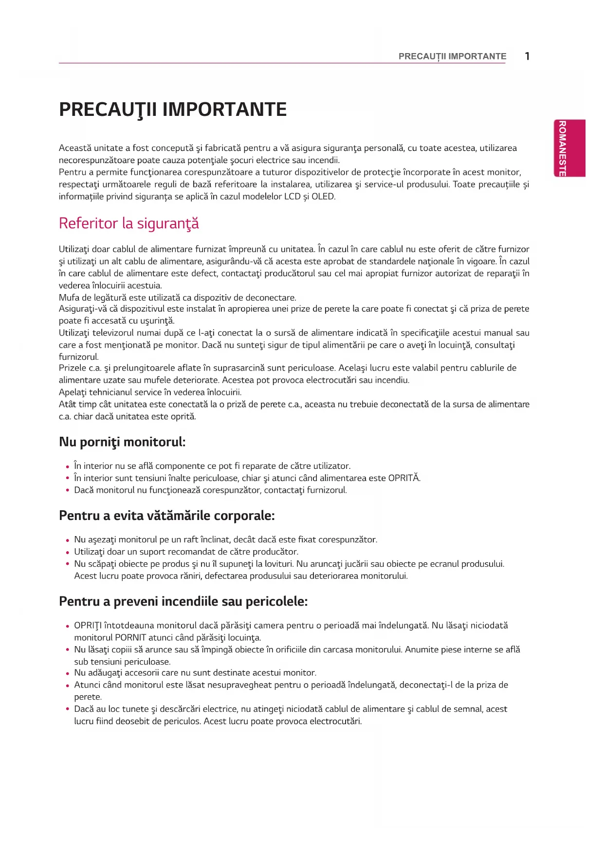 Această unitate a fost concepută şi fabricată pentru a vă asigura siguranţa personală, cu toate acestea, utilizarea necorespunzătoare poate cauza potenţiale şocuri electrice sau incendii. Pentru a permite funcţionarea corespunzătoare a tuturor dispozitivelor de protecţie încorporate în acest monitor, respectaţi următoarele reguli de bază referitoare la instalarea, utilizarea şi service-ul produsului. Toate precauțiile și informațiile privind siguranța se aplică în cazul modelelor LCD și OLED. Referitor la siguranţă Utilizaţi doar cablul de alimentare furnizat împreună cu unitatea. În cazul în care cablul nu este oferit de către furnizor şi utilizaţi un alt cablu de alimentare, asigurându-vă că acesta este aprobat de standardele naţionale în vigoare. În cazul în care cablul de alimentare este defect, contactaţi producătorul sau cel mai apropiat furnizor autorizat de reparaţii în vederea înlocuirii acestuia. Mufa de legătură este utilizată ca dispozitiv de deconectare. Asiguraţi-vă că dispozitivul este instalat în apropierea unei prize de perete la care poate fi conectat şi că priza de perete poate fi accesată cu uşurinţă. Utilizaţi televizorul numai după ce l-aţi conectat la o sursă de alimentare indicată în specificaţiile acestui manual sau care a fost menţionată pe monitor. Dacă nu sunteţi sigur de tipul alimentării pe care o aveţi în locuinţă, consultaţi furnizorul. Prizele c.a. şi prelungitoarele aflate în suprasarcină sunt periculoase. Acelaşi lucru este valabil pentru cablurile de alimentare uzate sau mufele deteriorate. Acestea pot provoca electrocutări sau incendiu. Apelaţi tehnicianul service în vederea înlocuirii. Atât timp cât unitatea este conectată la o priză de perete c.a., aceasta nu trebuie deconectată de la sursa de alimentare c.a. chiar dacă unitatea este oprită. Nu porniţi monitorul: