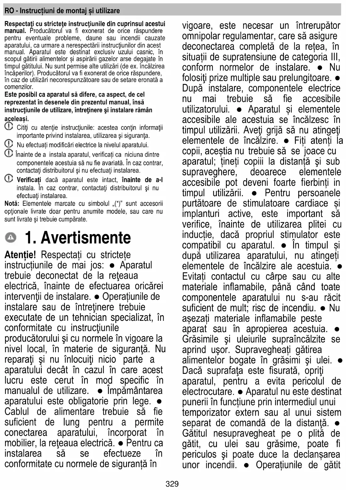 Atenție! Respectați cu strictețe instrucțiunile de mai jos: ● Aparatul trebuie deconectat de la reţeaua electrică, înainte de efectuarea oricărei intervenţii de instalare. ● Operațiunile de instalare sau de întreţinere trebuie executate de un tehnician specializat, în conformitate cu instrucţiunile producătorului şi cu normele în vigoare la nivel local, în materie de siguranţă. Nu reparaţi şi nu înlocuiţi nicio parte a aparatului decât în cazul în care acest lucru este cerut în mod specific în manualul de utilizare. ● Împământarea aparatului este obligatorie prin lege. ● Cablul de alimentare trebuie să fie suficient de lung pentru a permite conectarea aparatului, încorporat în mobilier, la reţeaua electrică. ● Pentru ca instalarea să se efectueze în conformitate cu normele de siguranță în vigoare, este necesar un întrerupător omnipolar regulamentar, care să asigure deconectarea completă de la rețea, în situații de supratensiune de categoria III, conform normelor de instalare. ● Nu folosiţi prize multiple sau prelungitoare. ● După instalare, componentele electrice nu mai trebuie să fie accesibile utilizatorului. ● Aparatul și elementele accesibile ale acestuia se încălzesc în timpul utilizării. Aveţi grijă să nu atingeţi elementele de încălzire. ● Fiți atenți la copii, aceștia nu trebuie să se joace cu aparatul; țineți copiii la distanță şi sub supraveghere, deoarece elementele accesibile pot deveni foarte fierbinți in timpul utilizării. ● Pentru persoanele purtătoare de stimulatoare cardiace și implanturi active, este important să verifice, înainte de utilizarea plitei cu inducție, dacă propriul stimulator este compatibil cu aparatul. ● În timpul și după utilizarea aparatului, nu atingeți elementele de încălzire ale acestuia. ● Evitați contactul cu cârpe sau cu alte materiale inflamabile, până când toate componentele aparatului nu s-au răcit suficient de mult; risc de incendiu. ● Nu așezați materiale inflamabile peste aparat sau în apropierea acestuia. ● Grăsimile şi uleiurile supraîncălzite se aprind uşor. Supravegheați gătirea alimentelor bogate în grăsimi şi ulei. ● Dacă suprafaţa este fisurată, opriţi aparatul, pentru a evita pericolul de electrocutare. ● Aparatul nu este destinat punerii în funcțiune prin intermediul unui temporizator extern sau al unui sistem separat de comandă de la distanţă. ● Gătitul nesupravegheat pe o plită de gătit, cu ulei sau grăsime, poate fi periculos şi poate duce la declanșarea unor incendii. ● Operațiunile de gătit330 trebuie să fie supravegheate. Un proces de gătire de scurtă durată trebuie supravegheat în permanență. ● Nu încercați NICIODATĂ să stingeți flăcările cu apă. Dimpotrivă, opriţi aparatul şi înăbușiți flăcările, folosind de exemplu un capac sau o pătură ignifugă. Pericol de incendiu: nu aşezaţi obiecte pe suprafeţele de gătit. ● Nu utilizați aparate de curăţare cu aburi; risc de electrocutare. ● Nu aşezaţi obiecte metalice, cum ar fi cuțite, furculițe, linguri și capace pe suprafaţa plitei de gătit, deoarece se pot supraîncălzi. ● Înainte de a conecta aparatul la reţeaua electrică: verificaţi plăcuţa cu date tehnice (aplicată în partea inferioară a aparatului) pentru a vă asigura că tensiunea şi puterea corespund celor ale rețelei, iar priza este potrivită. În caz de neclarități, adresați-vă unui electrician calificat. Important: ● După utilizare, închideți plita de gătit de la dispozitivul său de comandă şi nu vă bazaţi pe detectorul de vase de gătit. ● Evitaţi scurgerile de lichide și prin urmare, pentru a fierbe sau pentru a încălzi lichide, reduceţi alimentarea cu căldură. ● Nu lăsați elementele de încălzire pornite, cu oale şi tigăi goale sau fără recipiente pe acestea. ● După ce ați terminat de gătit, închideți respectiva zonă de gătit. ● Pentru a găti, nu folosiți niciodată coli de aluminiu și nu așezați niciodată direct pe plită produse ambalate în aluminiu. Aluminiul se poate topi și poate avaria iremediabil aparatul dumneavoastră. ● Nu încălziți niciodată o conservă sau un borcan din aluminiu ce conține alimente, fără să-l fi deschis mai întâi: ar putea exploda! Acest avertisment se aplică tuturor celorlalte tipuri de plite de gătit. ● Utilizarea unei puteri ridicate cum este funcţia Booster nu este adecvată pentru încălzirea unor anumite lichide cum ar fi, de exemplu, uleiul pentru prăjit. Căldura excesivă poate fi periculoasă. În astfel de situații, se recomandă utilizarea unei puteri mai scăzute. ● Recipientele trebuie așezate direct pe plita de gătit şi trebuie centrate. Sub nicio formă nu introduceţi alte obiecte între vasul de gătit şi plita de gătit. ● În cazul unor temperaturi ridicate, aparatul va reduce automat nivelul de putere aferent zonelor de gătit. ● Înaintea oricărei operațiuni de curățare sau de întreținere, decuplați aparatul de la rețeaua electrică, scoțându-l din priză sau decuplând întrerupătorul general de curent din locuință. ● Pentru toate operațiunile de instalare și întreținere, echipați-vă cu mănuși de protecție. ● Aparatul poate fi utilizat de copii cu vârsta mai mare de 8 ani şi de persoane cu capacităţi fizice, senzoriale sau mentale reduse, sau lipsite de experienţa sau cunoştinţele necesare, numai sub supraveghere sau numai după ce acestea au fost instruite cu privire la utilizarea în siguranţă a aparatului şi după ce au luat la cunoştinţă pericolele pe care le implică utilizarea acestuia. ● Copiii trebuie supravegheați, pentru a vă asigura că nu se joacă cu aparatul. ● Operaţiunile de curăţare şi întreţinere nu trebuie efectuate de copii nesupravegheaţi. ● Încăperea trebuie să fie suficient de bine ventilată,