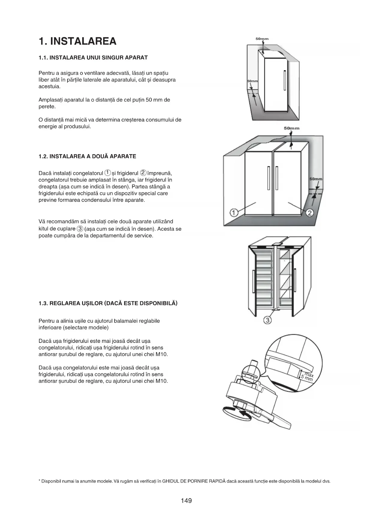 (aşacumseindicăîndesen).Acestase poatecumpăradeladepartamentuldeservice. 1.3. REGLAREA UŞILOR (DACĂ ESTE DISPONIBILĂ) Pentruaaliniauşilecuajutorulbalamaleireglabile inferioare(selectaremodele) Dacăuşafrigideruluiestemaijoasădecâtuşa congelatorului,ridicaţiuşafrigideruluirotindînsens antiorarşurubuldereglare,cuajutoruluneicheiM10. Dacăuşacongelatoruluiestemaijoasădecâtuşa frigiderului,ridicaţiuşacongelatoruluirotindînsens antiorarşurubuldereglare,cuajutoruluneicheiM10. *Disponibilnumailaanumitemodele.VărugămsăverificaţiînGHIDULDEPORNIRERAPIDĂdacăaceastăfuncţieestedisponibilălamodeluldvs. 50mm 50mm 5 mm max150