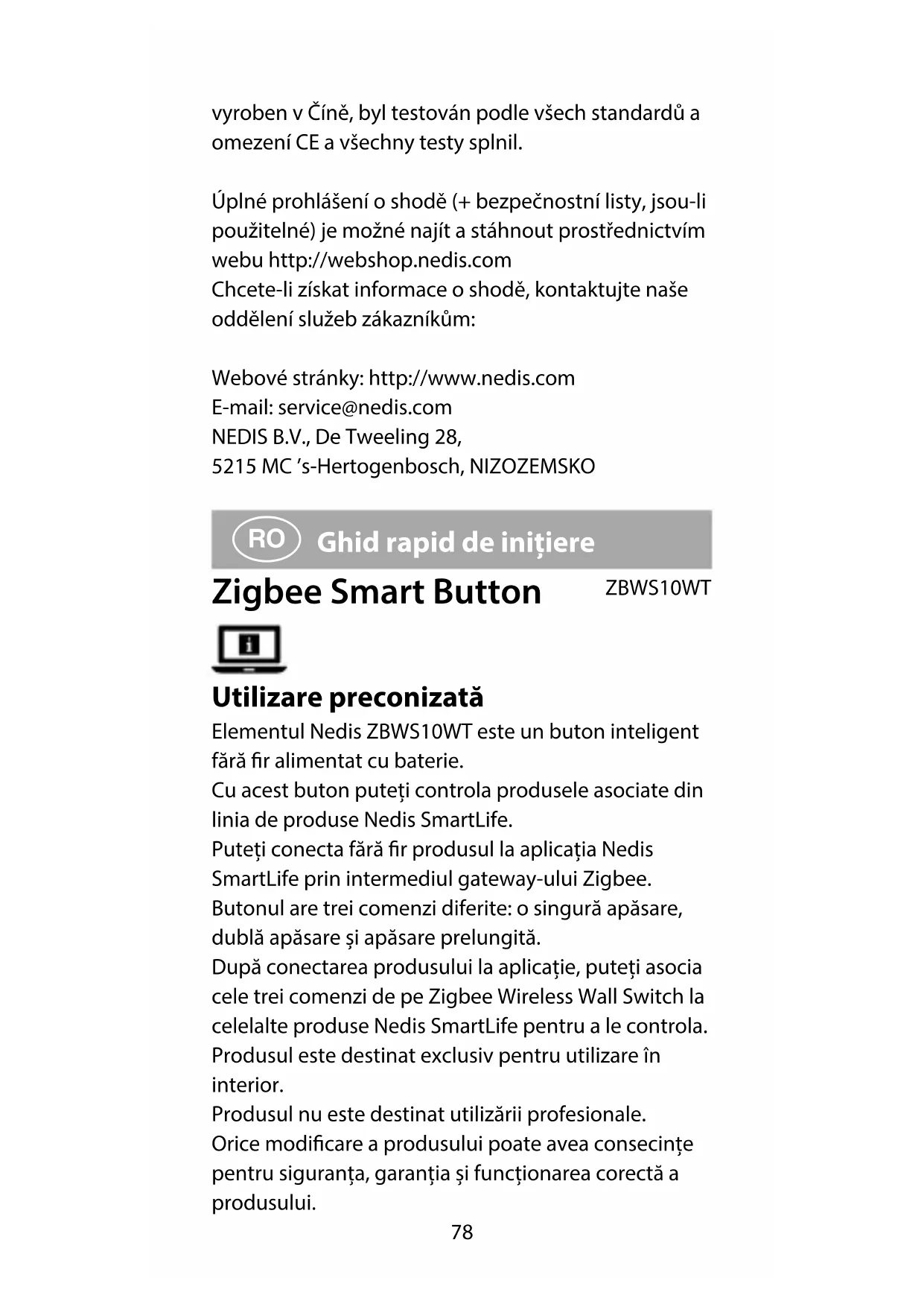 Ghid rapid de inițiere Zigbee Smart Button ZBWS10WT Utilizare preconizată Elementul Nedis ZBWS10WT este un buton inteligent fără r alimentat cu baterie. Cu acest buton puteți controla produsele asociate din linia de produse Nedis SmartLife. Puteți conecta fără r produsul la aplicația Nedis SmartLife prin intermediul gateway-ului Zigbee. Butonul are trei comenzi diferite: o singură apăsare, dublă apăsare și apăsare prelungită. După conectarea produsului la aplicație, puteți asocia cele trei comenzi de pe Zigbee Wireless Wall Switch la celelalte produse Nedis SmartLife pentru a le controla. Produsul este destinat exclusiv pentru utilizare în interior. Produsul nu este destinat utilizării profesionale. Orice modicare a produsului poate avea consecințe pentru siguranța, garanția și funcționarea corectă a produsului.79 vyroben v Číně, byl testován podle všech standardů a omezení CE a všechny testy splnil.Úplné prohlášení o shodě (+ bezpečnostní listy, jsou-li použitelné) je možné najít a stáhnout prostřednictvím webu http://webshop.nedis.comChcete-li získat informace o shodě, kontaktujte naše oddělení služeb zákazníkům:Webové stránky: http://www.nedis.comE-mail: service@nedis.comNEDIS B.V., De Tweeling 28,5215 MC ’s-Hertogenbosch, NIZOZEMSKO