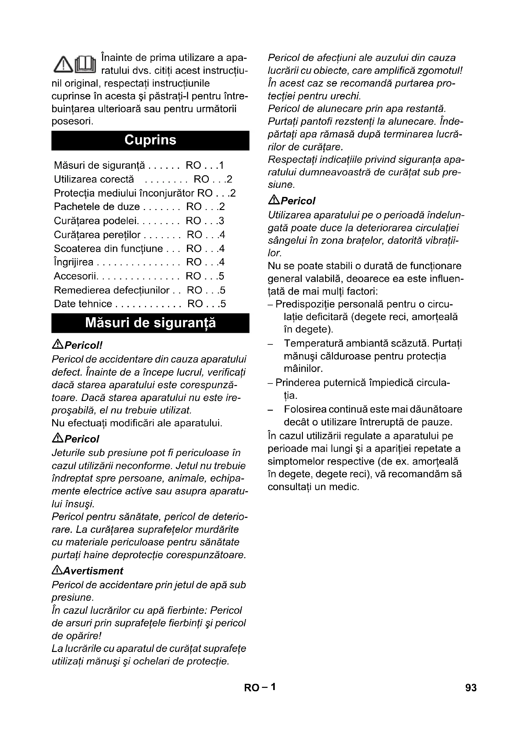 - 0,4 92 PL– 1 Înainte de prima utilizare a apa- ratului dvs. citiţi acest instrucţiu- nil original, respectaţi instrucţiunile cuprinse în acesta şi păstraţi-l pentru între- buinţarea ulterioară sau pentru următorii posesori. Pericol! Pericol de accidentare din cauza aparatului defect. Înainte de a începe lucrul, verificaţi dacă starea aparatului este corespunză- toare. Dacă starea aparatului nu este ire- proşabilă, el nu trebuie utilizat. Nu efectuaţi modificări ale aparatului. Pericol Jeturile sub presiune pot fi periculoase în cazul utilizării neconforme. Jetul nu trebuie îndreptat spre persoane, animale, echipa- mente electrice active sau asupra aparatu- lui însuşi. Pericol pentru sănătate, pericol de deterio- rare. La curăţarea suprafeţelor murdărite cu materiale periculoase pentru sănătate purtaţi haine deprotecţie corespunzătoare. 몇 Avertisment Pericol de accidentare prin jetul de apă sub presiune. În cazul lucrărilor cu apă fierbinte: Pericol de arsuri prin suprafeţele fierbinţi şi pericol de opărire! La lucrările cu aparatul de curăţat suprafeţe utilizaţi mănuşi şi ochelari de protecţie. Pericol de afecţiuni ale auzului din cauza lucrării cu obiecte, care amplifică zgomotul! În acest caz se recomandă purtarea pro- tecţiei pentru urechi. Pericol de alunecare prin apa restantă. Purtaţi pantofi rezstenţi la alunecare. Înde- părtaţi apa rămasă după terminarea lucră- rilor de curăţare. Respectaţi indicaţiile privind siguranţa apa- ratului dumneavoastră de curăţat sub pre- siune. Pericol Utilizarea aparatului pe o perioadă îndelun- gată poate duce la deteriorarea circulaţiei sângelui în zona braţelor, datorită vibraţii- lor. Nu se poate stabili o durată de funcţionare general valabilă, deoarece ea este influen- ţată de mai mulţi factori: – Predispoziţie personală pentru o circu- laţie deficitară (degete reci, amorţeală în degete). – Temperatură ambiantă scăzută. Purtaţi mănuşi călduroase pentru protecţia mâinilor. – Prinderea puternică împiedică circula- ţia. – Folosirea continuă este mai dăunătoare decât o utilizare întreruptă de pauze. În cazul utilizării regulate a aparatului pe perioade mai lungi şi a apariţiei repetate a simptomelor respective (de ex. amorţeală în degete, degete reci), vă recomandăm să consultaţi un medic. Cuprins Măsuri de siguranţă