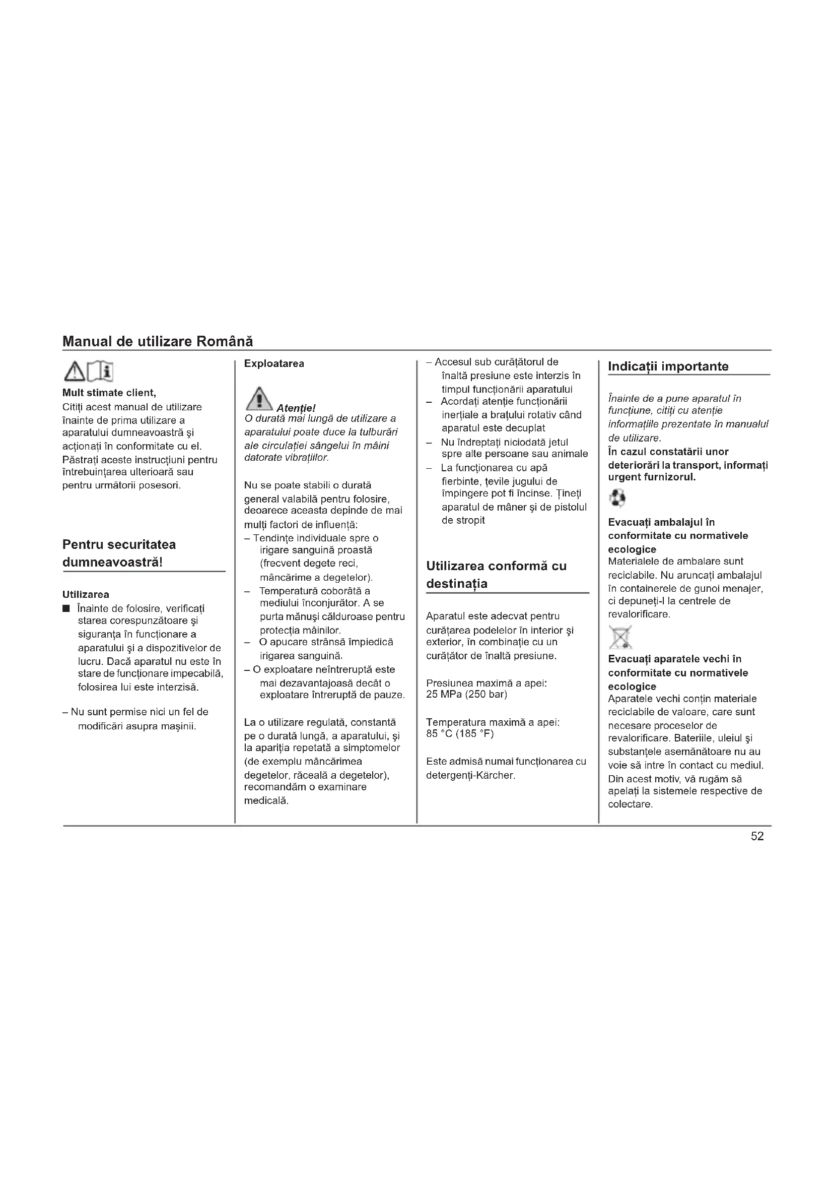 – O exploatare neîntreruptă este mai dezavantajoasă decât o exploatare întreruptă de pauze. La o utilizare regulată, constantă pe o durată lungă, a aparatului, úi la apariĠia repetată a simptomelor (de exemplu mâncărimea degetelor, răceală a degetelor), recomandăm o examinare medicală. – Accesul sub curăĠătorul de înaltă presiune este interzis în timpul funcĠionării aparatului – AcordaĠi atenĠie funcĠionării inerĠiale a braĠului rotativ când aparatul este decuplat – Nu îndreptaĠi niciodată jetul spre alte persoane sau animale – La funcĠionarea cu apă fierbinte, Ġevile jugului de împingere pot fi încinse. ğineĠi aparatul de mâner úi de pistolul de stropit Utilizarea conformă cu destinaĠia Aparatul este adecvat pentru curăĠarea podelelor în interior úi exterior, în combinaĠie cu un curăĠător de înaltă presiune. Presiunea maximă a apei: 25 MPa (250 bar) Temperatura maximă a apei: 85 °C (185 °F) Este admisă numai funcĠionarea cu detergenĠi-Kärcher. IndicaĠii importante Înainte de a pune aparatul în funcĠiune, citiĠi cu atenĠie informaĠiile prezentate în manualul de utilizare. În cazul constatării unor deteriorări la transport, informaĠi urgent furnizorul. EvacuaĠi ambalajul în conformitate cu normativele ecologice Materialele de ambalare sunt reciclabile. Nu aruncaĠi ambalajul în containerele de gunoi menajer, ci depuneĠi-l la centrele de revalorificare. EvacuaĠi aparatele vechi în conformitate cu normativele ecologice Aparatele vechi conĠin materiale reciclabile de valoare, care sunt necesare proceselor de revalorificare. Bateriile, uleiul úi substanĠele asemănătoare nu au voie să intre în contact cu mediul. Din acest motiv, vă rugăm să apelaĠi la sistemele respective de colectare.Manual de utilizare Română