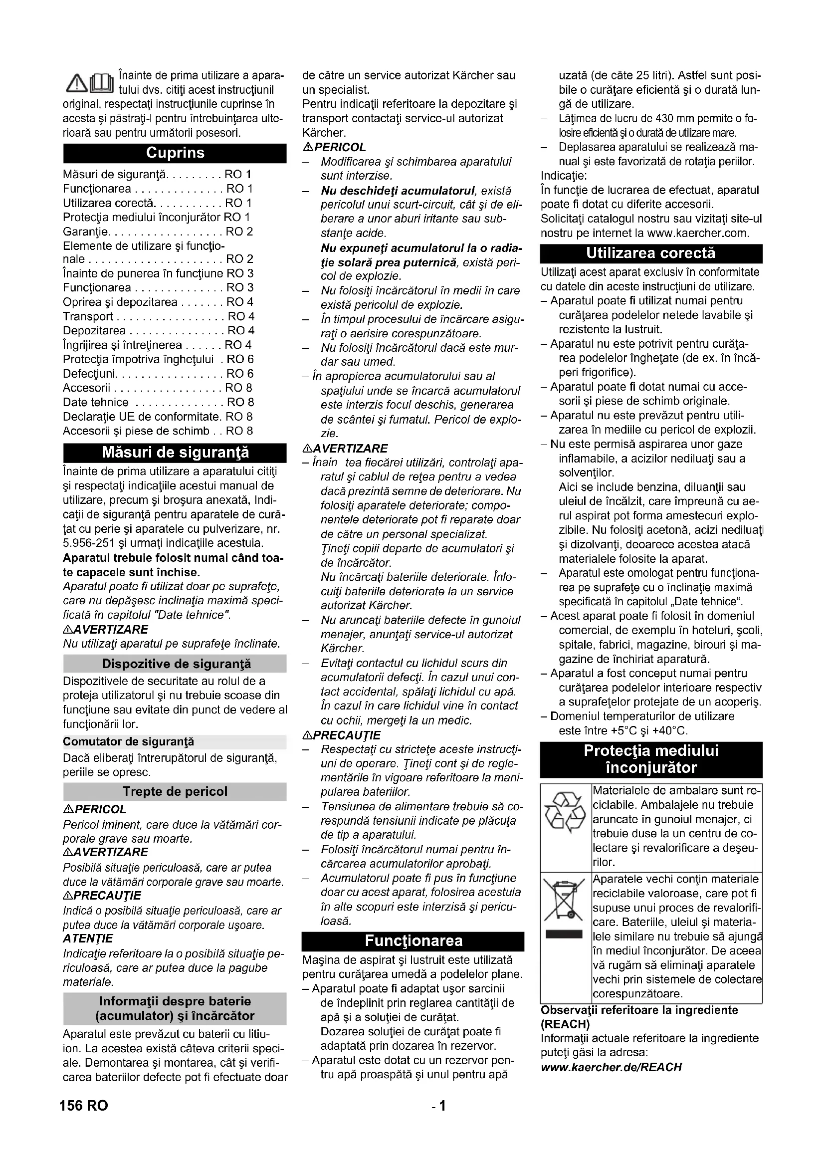 Wyposażenie dodatkowe i części zamienne Chairman of the Board of Management Director Regulatory Affairs & Certification 155PL- 1 Înainte de prima utilizare a apara- tului dvs. citiţi acest instrucţiunil original, respectaţi instrucţiunile cuprinse în acesta şi păstraţi-l pentru întrebuinţarea ulte- rioară sau pentru următorii posesori. Înainte de prima utilizare a aparatului citiţi şi respectaţi indicaţiile acestui manual de utilizare, precum şi broşura anexată, Indi- caţii de siguranţă pentru aparatele de cură- ţat cu perie şi aparatele cu pulverizare, nr. 5.956-251 şi urmaţi indicaţiile acestuia. Aparatul trebuie folosit numai când toa- te capacele sunt închise. Aparatul poate fi utilizat doar pe suprafeţe, care nu depăşesc inclinaţia maximă speci- ficată în capitolul "Date tehnice". 몇 AVERTIZARE Nu utilizaţi aparatul pe suprafeţe înclinate. Dispozitivele de securitate au rolul de a proteja utilizatorul şi nu trebuie scoase din funcţiune sau evitate din punct de vedere al funcţionării lor. Dacă eliberaţi întrerupătorul de siguranţă, periile se opresc. PERICOL Pericol iminent, care duce la vătămări cor- porale grave sau moarte. 몇 AVERTIZARE Posibilă situaţie periculoasă, care ar putea duce la vătămări corporale grave sau moarte. 몇 PRECAUŢIE Indică o posibilă situaţie periculoasă, care ar putea duce la vătămări corporale uşoare. ATENŢIE Indicaţie referitoare la o posibilă situaţie pe- riculoasă, care ar putea duce la pagube materiale. Aparatul este prevăzut cu baterii cu litiu- ion. La acestea există câteva criterii speci- ale. Demontarea şi montarea, cât şi verifi- carea bateriilor defecte pot fi efectuate doar de către un service autorizat Kärcher sau un specialist. Pentru indicaţii referitoare la depozitare şi transport contactaţi service-ul autorizat Kärcher. PERICOL – Modificarea şi schimbarea aparatului sunt interzise. – Nu deschideţi acumulatorul, există pericolul unui scurt-circuit, cât şi de eli- berare a unor aburi iritante sau sub- stanţe acide. Nu expuneţi acumulatorul la o radia- ţie solară prea puternică, există peri- col de explozie. – Nu folosiţi încărcătorul în medii în care există pericolul de explozie. – În timpul procesului de încărcare asigu- raţi o aerisire corespunzătoare. – Nu folosiţi încărcătorul dacă este mur- dar sau umed. – În apropierea acumulatorului sau al spaţiului unde se încarcă acumulatorul este interzis focul deschis, generarea de scântei şi fumatul. Pericol de explo- zie. 몇 AVERTIZARE – Înain tea fiecărei utilizări, controlaţi apa- ratul şi cablul de reţea pentru a vedea dacă prezintă semne de deteriorare. Nu folosiţi aparatele deteriorate; compo- nentele deteriorate pot fi reparate doar de către un personal specializat. Ţineţi copiii departe de acumulatori şi de încărcător. Nu încărcaţi bateriile deteriorate. Înlo- cuiţi bateriile deteriorate la un service autorizat Kärcher. – Nu aruncaţi bateriile defecte în gunoiul menajer, anunţaţi service-ul autorizat Kärcher. – Evitaţi contactul cu lichidul scurs din acumulatorii defecţi. În cazul unui con- tact accidental, spălaţi lichidul cu apă. În cazul în care lichidul vine în contact cu ochii, mergeţi la un medic. 몇 PRECAUŢIE – Respectaţi cu stricteţe aceste instrucţi- uni de operare. Ţineţi cont şi de regle- mentările în vigoare referitoare la mani- pularea bateriilor. – Tensiunea de alimentare trebuie să co- respundă tensi unii indicate pe plăcuţa de tip a aparatului. – Folosiţi încărcătorul numai pentru în- cărcarea acumulatorilor aprobaţi. – Acumulatorul poate fi pus în funcţiune doar cu acest aparat, folosirea acestuia în alte scopuri este interzisă şi pericu- loasă. Maşina de aspirat şi lustruit este utilizată pentru curăţarea umedă a podelelor plane. – Aparatul poate fi adaptat uşor sarcinii de îndeplinit prin reglarea cantităţii de apă şi a soluţiei de curăţat. Dozarea soluţiei de curăţat poate fi adaptată prin dozarea în rezervor. – Aparatul este dotat cu un rezervor pen- tru apă proaspătă şi unul pentru apă uzată (de câte 25 litri). Astfel sunt posi- bile o curăţare eficientă şi o durată lun- gă de utilizare.