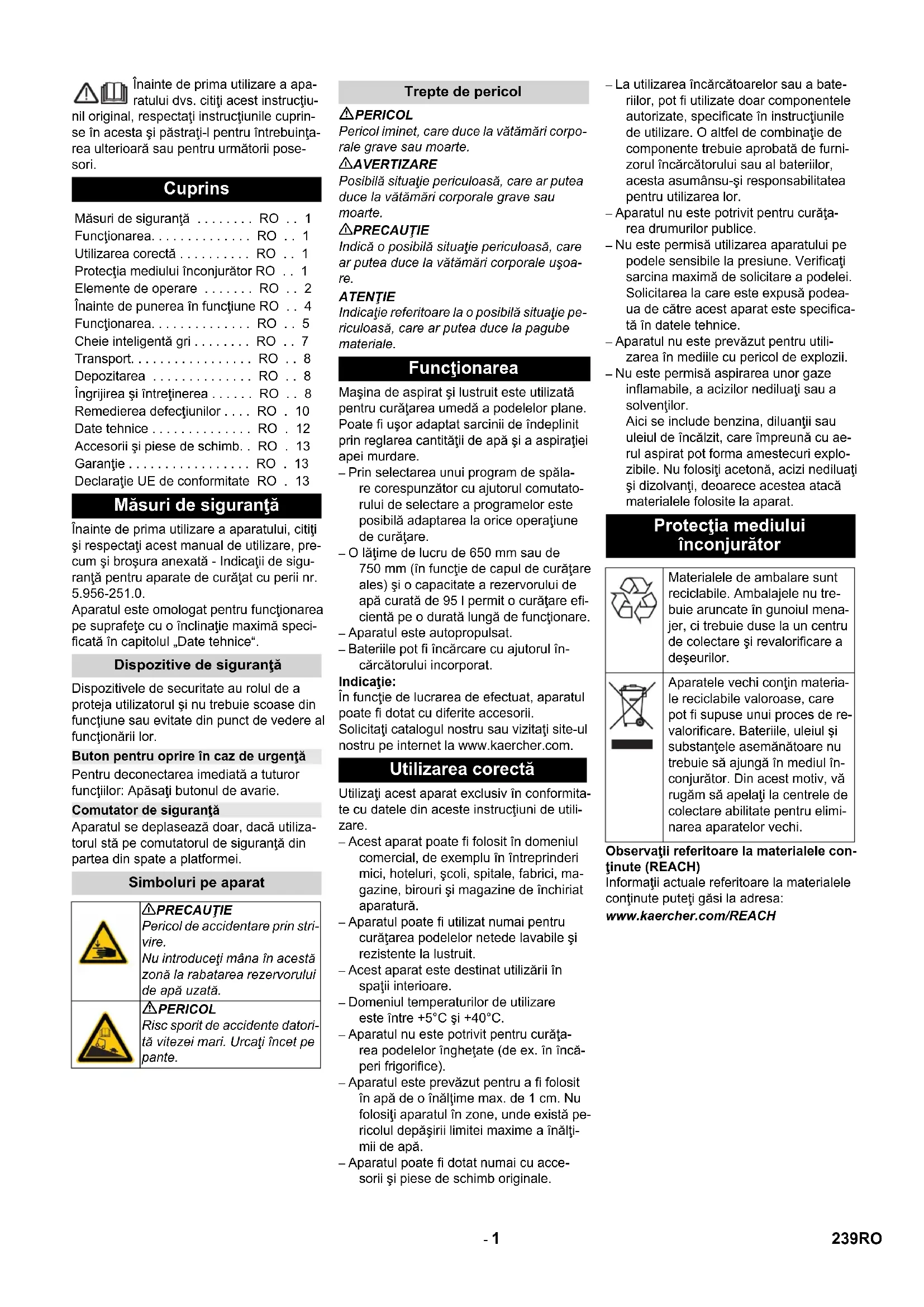 - Chairman of the Board of Management Director Regulatory Affairs & Certification 238 PL- 1 Înainte de prima utilizare a apa- ratului dvs. citiţi acest instrucţiu- nil original, respectaţi instrucţiunile cuprin- se în acesta şi păstraţi-l pentru întrebuinţa- rea ulterioară sau pentru următorii pose- sori. Înainte de prima utilizare a aparatului, citiţi şi respectaţi acest manual de utilizare, pre- cum şi broşura anexată - Indicaţii de sigu- ranţă pentru aparate de curăţat cu perii nr. 5.956-251.0. Aparatul este omologat pentru funcţionarea pe suprafeţe cu o înclinaţie maximă speci- ficată în capitolul „Date tehnice“. Dispozitivele de securitate au rolul de a proteja utilizatorul şi nu trebuie scoase din funcţiune sau evitate din punct de vedere al funcţionării lor. Pentru deconectarea imediată a tuturor funcţiilor: Apăsaţi butonul de avarie. Aparatul se deplasează doar, dacă utiliza- torul stă pe comutatorul de siguranţă din partea din spate a platformei. PERICOL Pericol iminet, care duce la vătămări corpo- rale grave sau moarte. 몇 AVERTIZARE Posibilă situaţie periculoasă, care ar putea duce la vătămări corporale grave sau moarte. 몇 PRECAUŢIE Indică o posibilă situaţie periculoasă, care ar putea duce la vătămări corporale uşoa- re. ATENŢIE Indicaţie referitoare la o posibilă situaţie pe- riculoasă, care ar putea duce la pagube materiale. Maşina de aspirat şi lustruit este utilizată pentru curăţarea umedă a podelelor plane. Poate fi uşor adaptat sarcinii de îndeplinit prin reglarea cantităţii de apă şi a aspiraţiei apei murdare. – Prin selectarea unui program de spăla- re corespunzător cu ajutorul comutato- rului de selectare a programelor este posibilă adaptarea la orice operaţiune de curăţare. – O lăţime de lucru de 650 mm sau de 750 mm (în funcţie de capul de curăţare ales) şi o capacitate a rezervorului de apă curată de 95 l permit o curăţare efi- cientă pe o durată lungă de funcţionare. – Aparatul este autopropulsat. – Bateriile pot fi încărcare cu ajutorul în- cărcătorului incorporat. Indicaţie: În funcţie de lucrarea de efectuat, aparatul poate fi dotat cu diferite accesorii. Solicitaţi catalogul nostru sau vizitaţi site-ul nostru pe internet la www.kaercher.com. Utilizaţi acest aparat exclusiv în conformita- te cu datele din aceste instrucţiuni de utili- zare. – Acest aparat poate fi folosit în domeniul comercial, de exemplu în întreprinderi mici, hoteluri, şcoli, spitale, fabrici, ma- gazine, birouri şi magazine de închiriat aparatură. – Aparatul poate fi utilizat numai pentru curăţarea podelelor netede lavabile şi rezistente la lustruit. – Acest aparat este destinat utilizării în spaţii interioare. – Domeniul temperaturilor de utilizare este între +5°C şi +40°C. – Aparatul nu este potrivit pentru curăţa- rea podelelor îngheţate (de ex. în încă- peri frigorifice). – Aparatul este prevăzut pentru a fi folosit în apă de o înălţime max. de 1 cm. Nu folosiţi aparatul în zone, unde există pe- ricolul depăşirii limitei maxime a înălţi- mii de apă. – Aparatul poate fi dotat numai cu acce- sorii şi piese de schimb originale. – La utilizarea încărcătoarelor sau a bate- riilor, pot fi utilizate doar componentele autorizate, specificate în instrucţiunile de utilizare. O altfel de combinaţie de componente trebuie aprobată de furni- zorul încărcătorului sau al bateriilor, acesta asumânsu-şi responsabilitatea pentru utilizarea lor. – Aparatul nu este potrivit pentru curăţa- rea drumurilor publice. – Nu este permisă utilizarea aparatului pe podele sensibile la presiune. Verificaţi sarcina maximă de solicitare a podelei. Solicitarea la care este expusă podea- ua de către acest aparat este specifica- tă în datele tehnice. – Aparatul nu este prevăzut pentru utili- zarea în mediile cu pericol de explozii. – Nu este permisă aspirarea unor gaze inflamabile, a acizilor nediluaţi sau a solvenţilor. Aici se include benzina, diluanţii sau uleiul de încălzit, care împreună cu ae- rul aspirat pot forma amestecuri explo- zibile. Nu folosiţi acetonă, acizi nediluaţi şi dizolvanţi, deoarece acestea atacă materialele folosite la aparat. Observaţii referitoare la materialele con- ţinute (REACH) Informaţii actuale referitoare la materialele conţinute puteţi găsi la adresa: www.kaercher.com/REACH Cuprins Măsuri de siguranţă