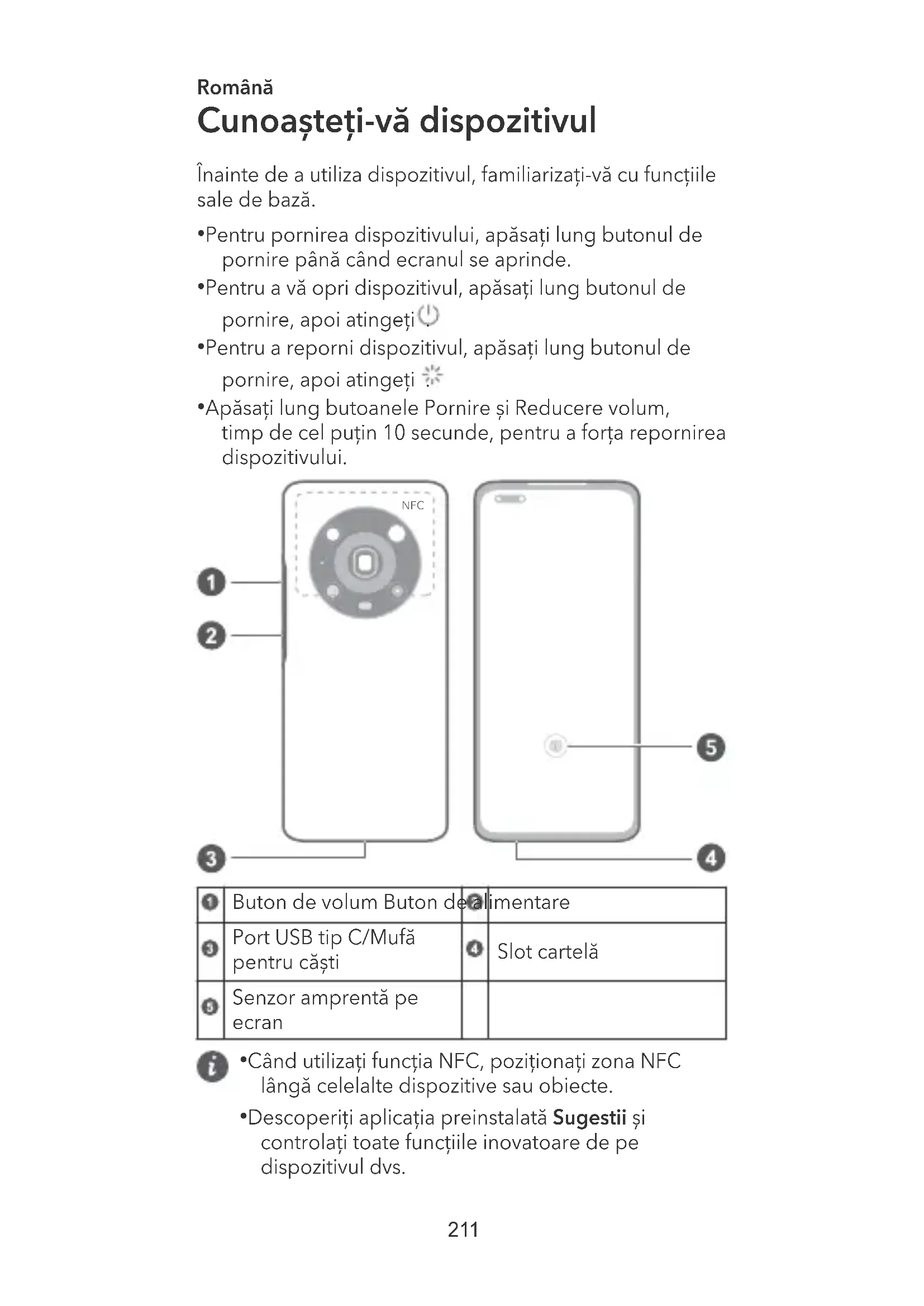 210Română Cunoașteți-vă dispozitivul Înainte de a utiliza dispozitivul, familiarizați-vă cu funcțiile sale de bază.