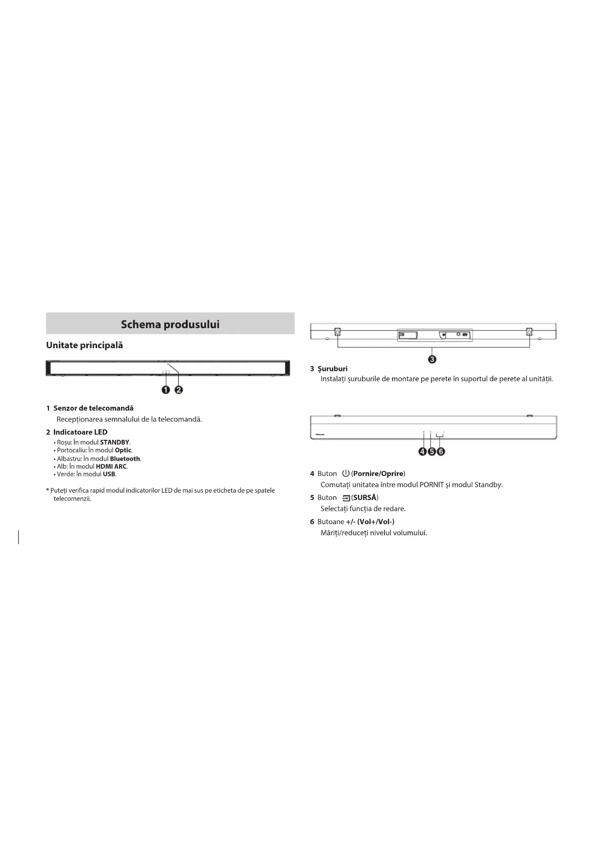 - Puteți verifica rapid modul indicatorilor LED de mai sus pe eticheta de pe spatele telecomenzii. 3 Șuruburi Instalați șuruburile de montare pe perete în suportul de perete al unității. 4 Buton (Pornire/Oprire) Comutați unitatea între modul PORNIT și modul Standby. 5 Buton (SURSĂ) Selectați funcția de redare. 6 Butoane +/- (Vol+/Vol-) Măriți/reduceți nivelul volumului.EN