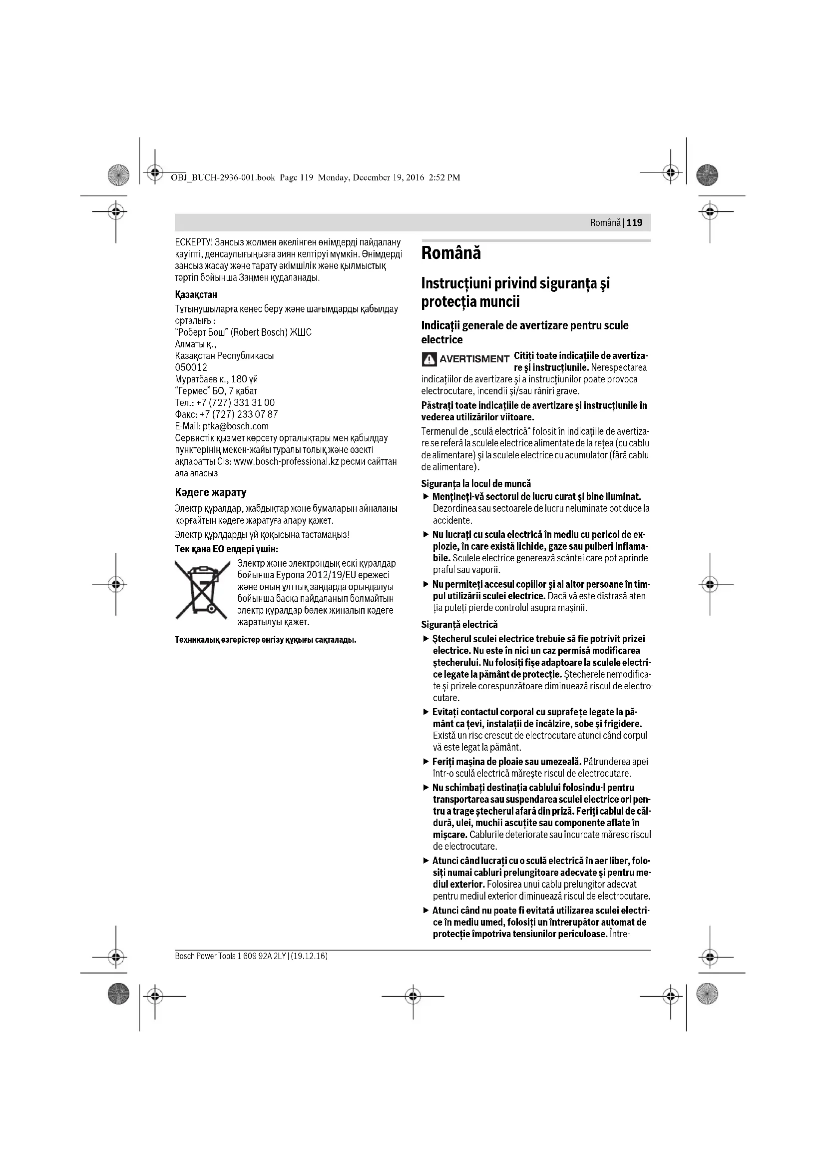 Кәдеге жарату Электр құралдар, жабдықтар және бумаларын айналаны қорғайтын кәдеге жаратуға апару қажет. Электр құрлдарды үй қоқысына тастамаңыз! Тек қана ЕО елдері үшін: Электр және электрондық ескі құралдар бойынша Еуропа 2012/19/EU ережесі және оның ұлттық заңдарда орындалуы бойынша басқа пайдаланып болмайтын электр құралдар бөлек жиналып кәдеге жаратылуы қажет. Техникалық өзгерістер енгізу құқығы сақталады. Română Instrucţiuni privind siguranţa şi protecţia muncii Indicaţii generale de avertizare pentru scule electrice Citiţi toate indicaţiile de avertiza- re şi instrucţiunile. Nerespectarea indicaţiilor de avertizare şi a instrucţiunilor poate provoca electrocutare, incendii şi/sau răniri grave. Păstraţi toate indicaţiile de avertizare şi instrucţiunile în vederea utilizărilor viitoare. Termenul de „sculă electrică“ folosit în indicaţiile de avertiza- re se referă la sculele electrice alimentate de la reţea (cu cablu de alimentare) şi la sculele electrice cu acumulator (fără cablu de alimentare). Siguranţa la locul de muncă Menţineţi-vă sectorul de lucru curat şi bine iluminat. Dezordinea sau sectoarele de lucru neluminate pot duce la accidente. Nu lucraţi cu scula electrică în mediu cu pericol de ex- plozie, în care există lichide, gaze sau pulberi inflama- bile. Sculele electrice generează scântei care pot aprinde praful sau vaporii. Nu permiteţi accesul copiilor şi al altor persoane în tim- pul utilizării sculei electrice. Dacă vă este distrasă aten- ţia puteţi pierde controlul asupra maşinii. Siguranţă electrică Ştecherul sculei electrice trebuie să fie potrivit prizei electrice. Nu este în nici un caz permisă modificarea ştecherului. Nu folosiţi fişe adaptoare la sculele electri- ce legate la pământ de protecţie. Ştecherele nemodifica- te şi prizele corespunzătoare diminuează riscul de electro- cutare. Evitaţi contactul corporal cu suprafe ţe legate la pă- mânt ca ţevi, instalaţii de încălzire, sobe şi frigidere. Există un risc crescut de electrocutare atunci când corpul vă este legat la pământ. Feriţi maşina de ploaie sau umezeală. Pătrunderea apei într-o sculă electrică măreşte riscul de electrocutare. Nu schimbaţi destinaţia cablului folosindu-l pentru transportarea sau suspendarea sculei electrice ori pen- tru a trage ştecherul afară din priză. Feriţi cablul de căl- dură, ulei, muchii ascuţite sau componente aflate în mişcare. Cablurile deteriorate sau încurcate măresc riscul de electrocutare. Atunci când lucraţi cu o sculă electrică în aer liber, folo- siţi numai cabluri prelungitoare adecvate şi pentru me- diul exterior. Folosirea unui cablu prelungitor adecvat pentru mediul exterior diminuează riscul de electrocutare. Atunci când nu poate fi evitată utilizarea sculei electri- ce în mediu umed, folosiţi un întrerupător automat de protecţie împotriva tensiunilor periculoase. Între- AVERTISMEN