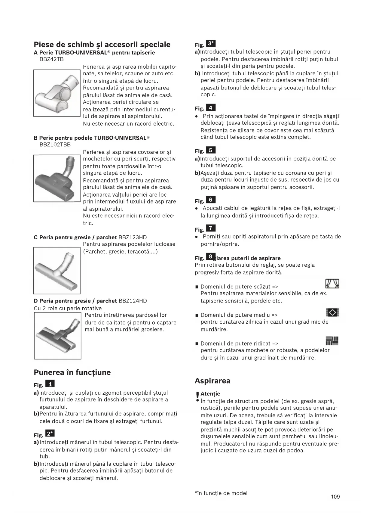 ingură etapă de lucru. Recomandată şi pentru aspirarea părului lăsat de animalele de casă. Acţionarea valţului periei are loc prin intermediul fluxului de aspirare al aspiratorului. Nu este necesar niciun racord elec- tric. C Peria pentru gresie / parchet BBZ123HD Pentru aspirarea podelelor lucioase (Parchet, gresie, teracotă,...) D Peria pentru gresie / parchet BBZ124HD Cu 2 role cu perie rotative Pentru întreţinerea pardoselilor dure de calitate şi pentru o captare mai bună a murdăriei grosiere. Punerea în funcţiune Fig. a)Introduceţi şi cuplaţi cu zgomot perceptibil ştuţul furtunului de aspirare în deschidere de aspirare a aparatului. b)Pentru înlăturarea furtunului de aspirare, comprimaţi cele două ciocuri de fixare şi extrageţi furtunul. Fig. a)Introduceţi mânerul în tubul telescopic. Pentru desfa- cerea îmbinării rotiţi puţin mânerul şi scoateţi-l din tub. b)Introduceţi mânerul până la cuplare în tubul telesco- pic. Pentru desfacerea îmbinării apăsaţi butonul de deblocare şi scoateţi mânerul.