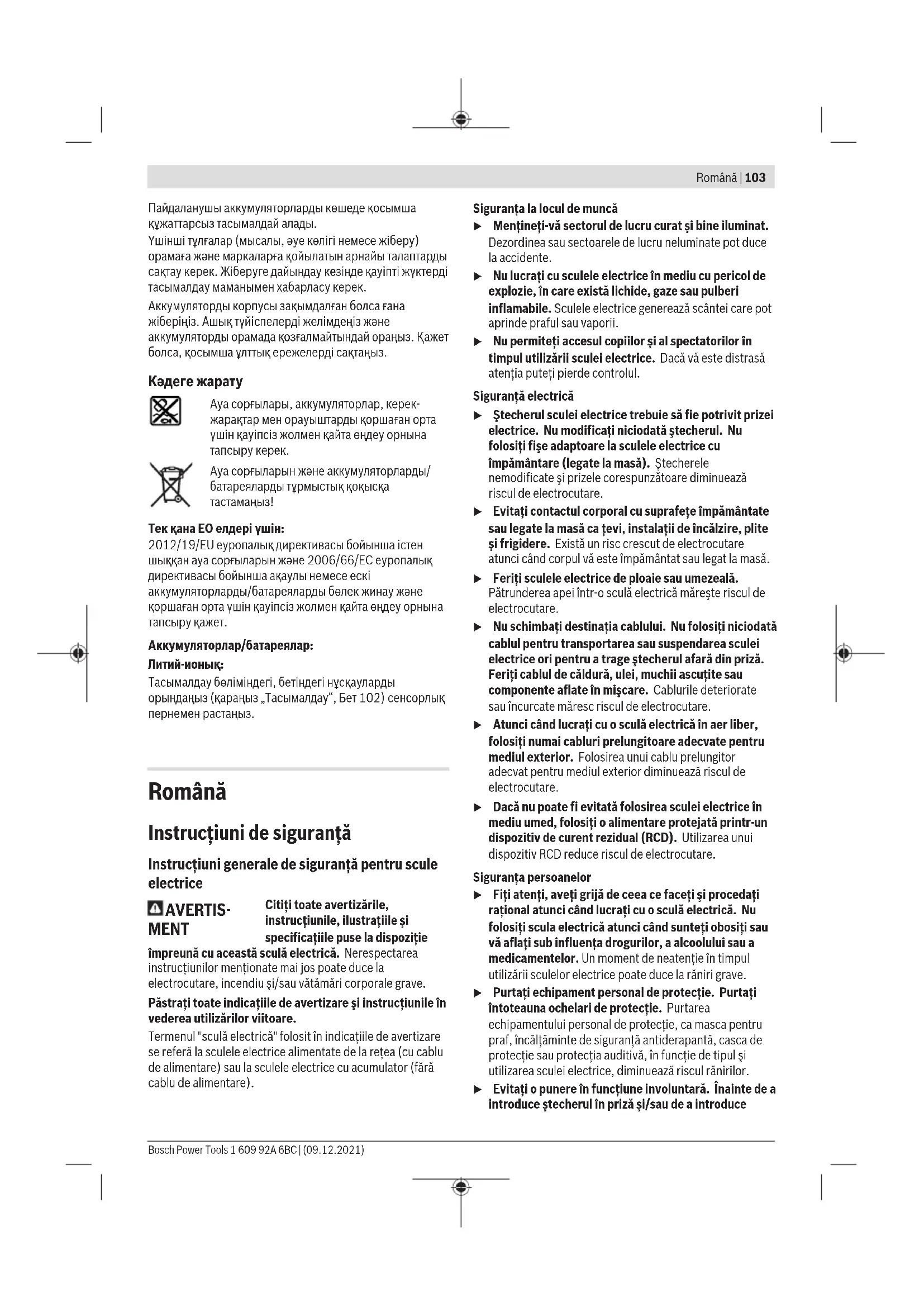 Ұсынылған литий-иондық аккумуляторлар қауіпті тауарларға қойылатын талаптарға бағынады. 1 609 92A 6BC | (09.12.2021) Bosch Power ToolsRomână | 103 Пайдаланушы аккумуляторларды көшеде қосымша құжаттарсыз тасымалдай алады. Үшінші тұлғалар (мысалы, әуе көлігі немесе жіберу) орамаға және маркаларға қойылатын арнайы талаптарды сақтау керек. Жіберуге дайындау кезінде қауіпті жүктерді тасымалдау маманымен хабарласу керек. Аккумуляторды корпусы зақымдалған болса ғана жіберіңіз. Ашық түйіспелерді желімдеңіз және аккумуляторды орамада қозғалмайтындай ораңыз. Қажет болса, қосымша ұлттық ережелерді сақтаңыз. Кәдеге жарату Ауа сорғылары, аккумуляторлар, керек- жарақтар мен орауыштарды қоршаған орта үшін қауіпсіз жолмен қайта өңдеу орнына тапсыру керек. Ауа сорғыларын және аккумуляторларды/ батареяларды тұрмыстық қоқысқа тастамаңыз! Тек қана ЕО елдері үшін: 2012/19/EU еуропалық директивасы бойынша істен шыққан ауа сорғыларын және 2006/66/EC еуропалық директивасы бойынша ақаулы немесе ескі аккумуляторларды/батареяларды бөлек жинау және қоршаған орта үшін қауіпсіз жолмен қайта өңдеу орнына тапсыру қажет. Аккумуляторлар/батареялар: Литий-ионық: Тасымалдау бөліміндегі, бетіндегі нұсқауларды орындаңыз (қараңыз „Тасымалдау“, Бет102) сенсорлық пернемен растаңыз. Română Instrucţiuni de siguranţă Instrucţiuni generale de siguranţă pentru scule electrice AVERTIS- MENT Citiţi toate avertizările, instrucţiunile, ilustraţiile şi specificaţiile puse la dispoziţie împreună cu această sculă electrică. Nerespectarea instrucţiunilor menţionate mai jos poate duce la electrocutare, incendiu şi/sau vătămări corporale grave. Păstraţi toate indicaţiile de avertizare şi instrucţiunile în vederea utilizărilor viitoare. Termenul "sculă electrică" folosit în indicaţiile de avertizare se referă la sculele electrice alimentate de la reţea (cu cablu de alimentare) sau la sculele electrice cu acumulator (fără cablu de alimentare). Siguranţa la locul de muncă u Menţineţi‑vă sectorul de lucru curat şi bine iluminat. Dezordinea sau sectoarele de lucru neluminate pot duce la accidente. u Nu lucraţi cu sculele electrice în mediu cu pericol de explozie, în care există lichide, gaze sau pulberi inflamabile. Sculele electrice generează scântei care pot aprinde praful sau vaporii. u Nu permiteţi accesul copiilor şi al spectatorilor în timpul utilizării sculei electrice. Dacă vă este distrasă atenţia puteţi pierde controlul. Siguranţă electrică u Ştecherul sculei electrice trebuie să fie potrivit prizei electrice. Nu modificaţi niciodată ştecherul. Nu folosiţi fişe adaptoare la sculele electrice cu împământare (legate la masă). Ştecherele nemodificate şi prizele corespunzătoare diminuează riscul de electrocutare. u Evitaţi contactul corporal cu suprafeţe împământate sau legate la masă ca ţevi, instalaţii de încălzire, plite şi frigidere. Există un risc crescut de electrocutare atunci când corpul vă este împământat sau legat la masă. u Feriţi sculele electrice de ploaie sau umezeală. Pătrunderea apei într‑o sculă electrică măreşte riscul de electrocutare. u Nu schimbaţi destinaţia cablului. Nu folosiţi niciodată cablul pentru transportarea sau suspendarea sculei electrice ori pentru a trage ştecherul afară din priză. Feriţi cablul de căldură, ulei, muchii ascuţite sau componente aflate în mişcare. Cablurile deteriorate sau încurcate măresc riscul de electrocutare. u Atunci când lucraţi cu o sculă electrică în aer liber, folosiţi numai cabluri prelungitoare adecvate pentru mediul exterior. Folosirea unui cablu prelungitor adecvat pentru mediul exterior diminuează riscul de electrocutare. u Dacă nu poate fi evitată folosirea sculei electrice în mediu umed, folosiţi o alimentare protejată printr-un dispozitiv de curent rezidual (RCD). Utilizarea unui dispozitiv RCD reduce riscul de electrocutare. Siguranţa persoanelor u Fiţi atenţi, aveţi grijă de ceea ce faceţi şi procedaţi raţional atunci când lucraţi cu o sculă electrică. Nu folosiţi scula electrică atunci când sunteţi obosiţi sau vă aflaţi sub influenţa drogurilor, a alcoolului sau a medicamentelor. Un moment de neatenţie în timpul utilizării sculelor electrice poate duce la răniri grave. u Purtaţi echipament personal de protecţie. Purtaţi întoteauna ochelari de protecţie. Purtarea echipamentului personal de protecţie, ca masca pentru praf, încălţăminte de siguranţă antiderapantă, casca de protecţie sau protecţia auditivă, în funcţie de tipul şi utilizarea sculei electrice, diminuează riscul rănirilor. u Evitaţi o punere în funcţiune involuntară. Înainte de a introduce ştecherul în priză şi/sau de a introduce Bosch Power Tools 1 609 92A 6BC | (09.12.2021)104 | Română acumulatorul în scula electrică, de a o ridica sau de a o transporta, asiguraţi‑vă că aceasta este oprită. Dacă atunci când tr
