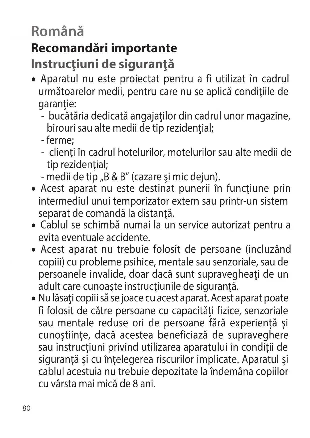 - Aparatul nu este proiectat pentru a fi utilizat în cadrul următoarelor medii, pentru care nu se aplică condiţiile de garanţie: - bucătăria dedicată angajaţilor din cadrul unor magazine, birouri sau alte medii de tip rezidenţial; - ferme; - clienţi în cadrul hotelurilor, motelurilor sau alte medii de tip rezidenţial; - medii de tip „B & B” (cazare şi mic dejun).