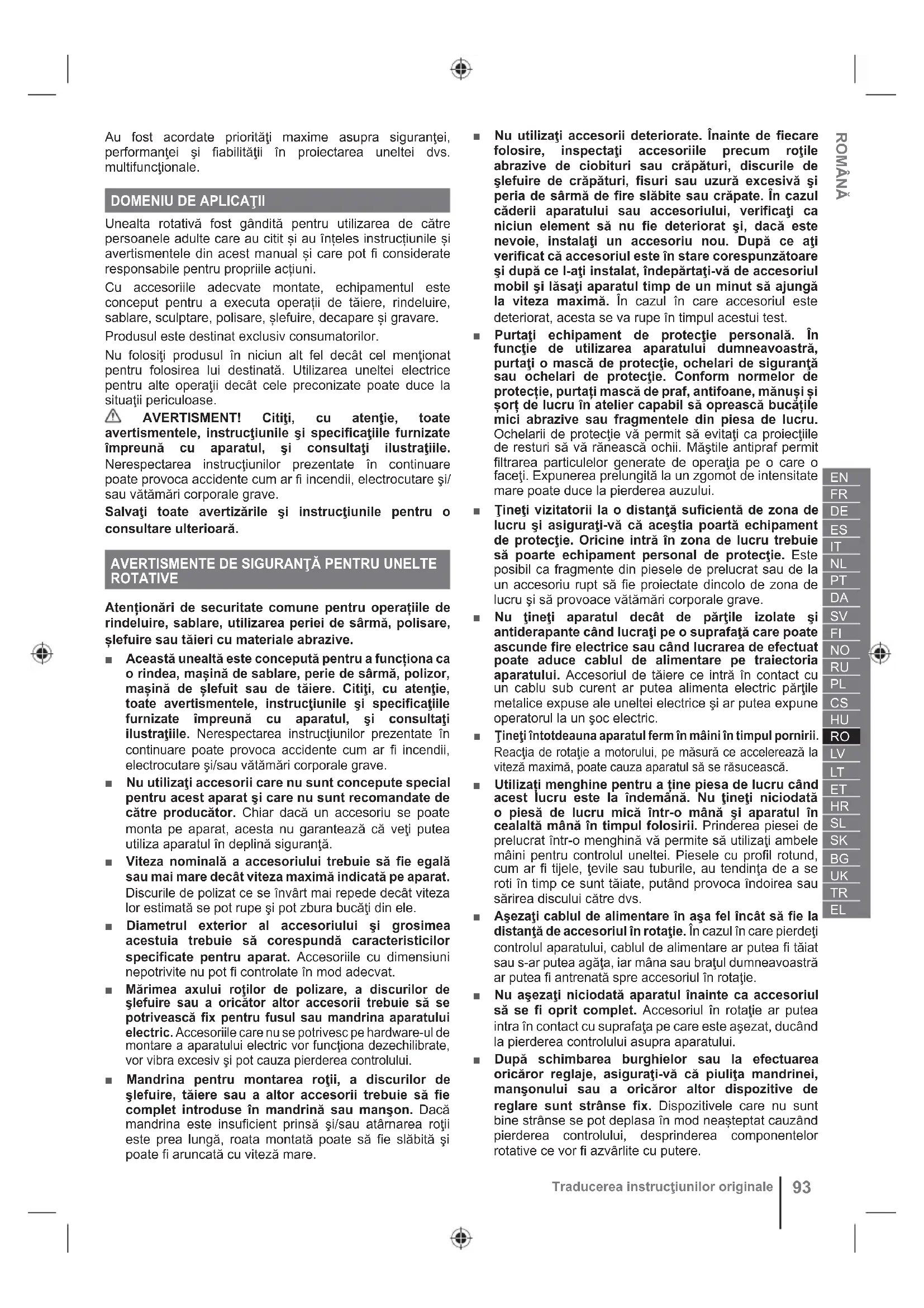 Unealta rotativă fost gândită pentru utilizarea de către persoanele adulte care au citit și au înțeles instrucțiunile și avertismentele din acest manual și care pot fi considerate responsabile pentru propriile acțiuni. Cu accesoriile adecvate montate, echipamentul este conceput pentru a executa operații de tăiere, rindeluire, sablare, sculptare, polisare, șlefuire, decapare și gravare. Produsul este destinat exclusiv consumatorilor. Nu folosiţi produsul în niciun alt fel decât cel menţionat pentru folosirea lui destinată. Utilizarea uneltei electrice pentru alte operaţii decât cele preconizate poate duce la situaţii periculoase. AVERTISMENT! Citiţi, cu atenţie, toate avertismentele, instrucţiunile şi specificaţiile furnizate împreună cu aparatul, şi consultaţi ilustraţiile. Nerespectarea instrucţiunilor prezentate în continuare poate provoca accidente cum ar fi incendii, electrocutare şi/ sau vătămări corporale grave. Salvaţi toate avertizările şi instrucţiunile pentru o consultare ulterioară.