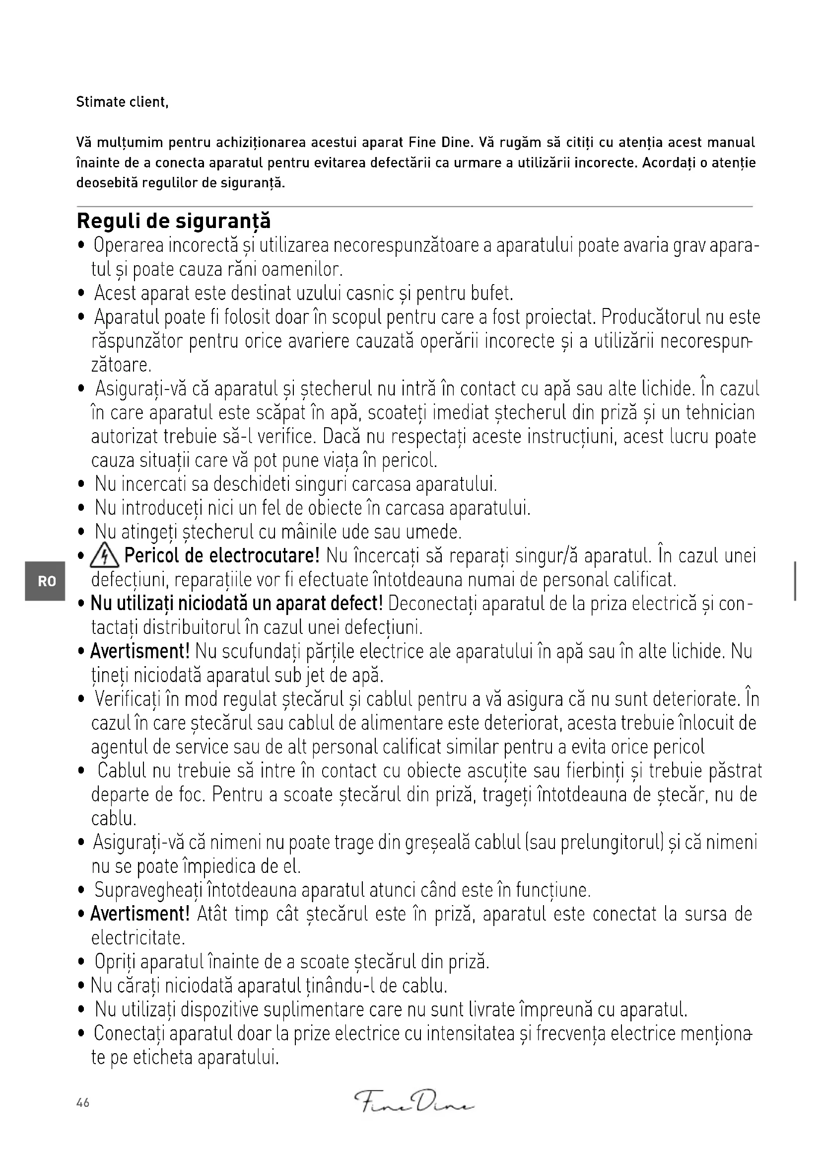 Stimate client, Vă mulțumim pentru achiziționarea acestui aparat Fine Dine. Vă rugăm să citiți cu atenția acest manual înainte de a conecta aparatul pentru evitarea defectării ca urmare a utilizării incorecte. Acordați o atenție deosebită regulilor de siguranță. Reguli de siguranță