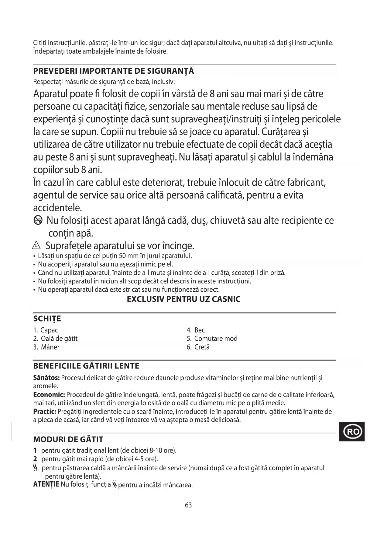 Aparatul poate fi folosit de copii ⟨n vársta⟩ de 8 ani sau mai mari.si de catre persone cu capacităti fizice, senzoriale sau mentale reduse sau lipsa de experientă si cunoştințe dacă sunt supravegheata/instruiţi.si inteleg pericolele la care se supun. Copii nu trebuie sα se joace cu aparatul. Curățarea.siutilizarea de câtre UTILIZATOR nu trebuie efectuate de copii decât dacă aceția au peste 8 ani.si sunt supravegheata. Nu lasaţi aparatul.si cablul la indemâna copiilor sub 8 ani.