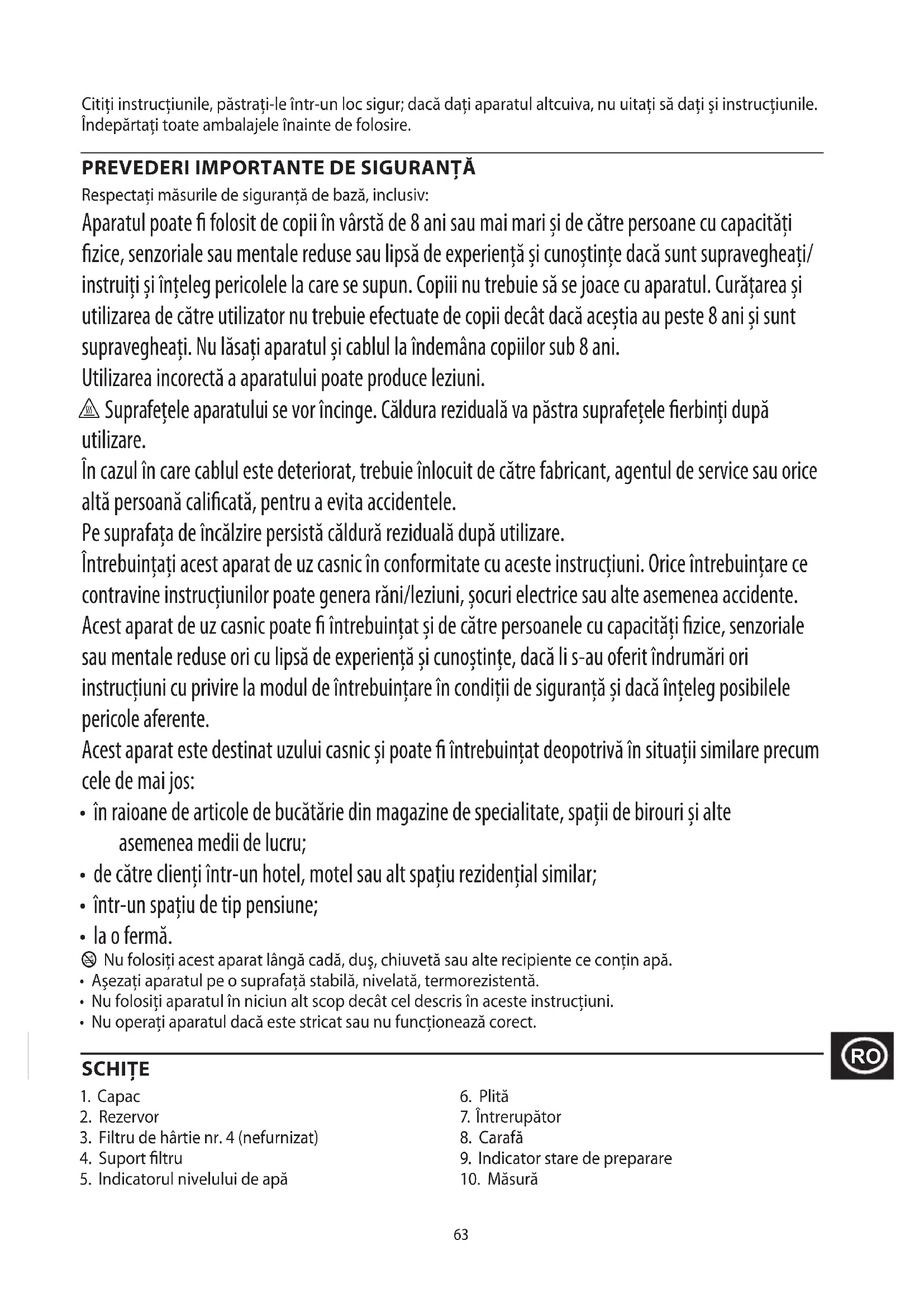 Respectați măsurile de siguranță de bază, inclusiv: Aparatul poate fi folosit de copii în vârstă de 8 ani sau mai mari și de către persoane cu capacități fizice, senzoriale sau mentale reduse sau lipsă de experiență și cunoștințe dacă sunt supravegheați/ instruiți și înțeleg pericolele la care se supun. Copiii nu trebuie să se joace cu aparatul. Curățarea și utilizarea de către utilizator nu trebuie efectuate de copii decât dacă aceștia au peste 8 ani și sunt supravegheați. Nu lăsați aparatul și cablul la îndemâna copiilor sub 8 ani. Utilizarea incorectă a aparatului poate produce leziuni. h Suprafețele aparatului se vor încinge. Căldura reziduală va păstra suprafețele fierbinți după utilizare. În cazul în care cablul este deteriorat, trebuie înlocuit de către fabricant, agentul de service sau orice altă persoană calificată, pentru a evita accidentele. Pe suprafața de încălzire persistă căldură reziduală după utilizare. Întrebuințați acest aparat de uz casnic în conformitate cu aceste instrucțiuni. Orice întrebuințare ce contravine instrucțiunilor poate genera răni/leziuni, șocuri electrice sau alte asemenea accidente. Acest aparat de uz casnic poate fi întrebuințat și de către persoanele cu capacități fizice, senzoriale sau mentale reduse ori cu lipsă de experiență și cunoștințe, dacă li s-au oferit îndrumări ori instrucțiuni cu privire la modul de întrebuințare în condiții de siguranță și dacă înțeleg posibilele pericole aferente. Acest aparat este destinat uzului casnic și poate fi întrebuințat deopotrivă în situații similare precum cele de mai jos:
