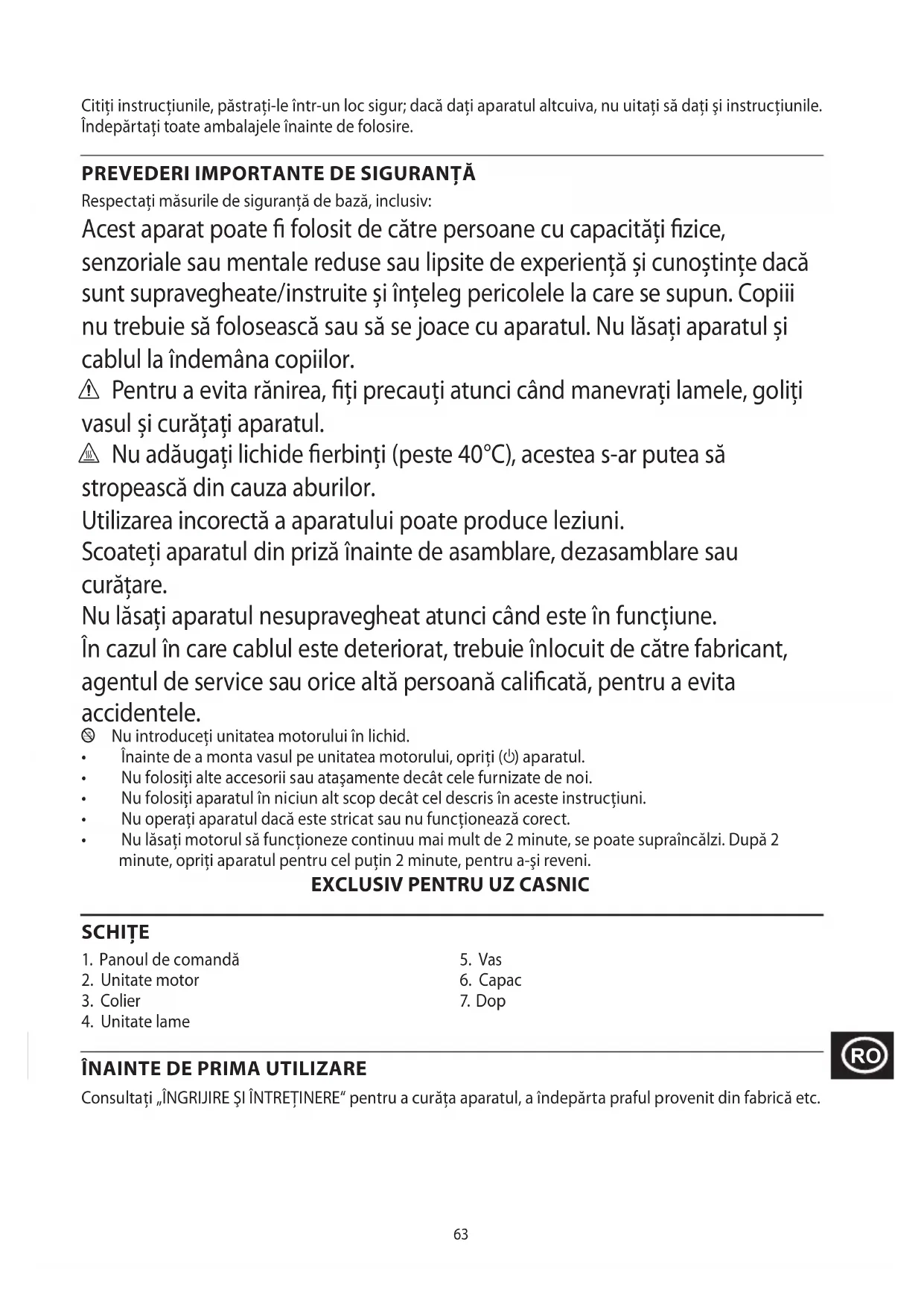 Respectaţi măsurile de siguranţă de bază, inclusiv: Acest aparat poate folosit de către persoane cu capacități zice, senzoriale sau mentale reduse sau lipsite de experiență și cunoștințe dacă sunt supravegheate/instruite și înțeleg pericolele la care se supun. Copiii nu trebuie să folosească sau să se joace cu aparatul. Nu lăsați aparatul și cablul la îndemâna copiilor. c Pentru a evita rănirea, ți precauți atunci când manevrați lamele, goliți vasul și curățați aparatul. h Nu adăugaţi lichide erbinţi (peste 40°C), acestea s-ar putea să stropească din cauza aburilor. Utilizarea incorectă a aparatului poate produce leziuni. Scoateţi aparatul din priză înainte de asamblare, dezasamblare sau curăţare. Nu lăsaţi aparatul nesupravegheat atunci când este în funcţiune. În cazul în care cablul este deteriorat, trebuie înlocuit de către fabricant, agentul de service sau orice altă persoană calicată, pentru a evita accidentele. l Nu introduceți unitatea motorului în lichid.