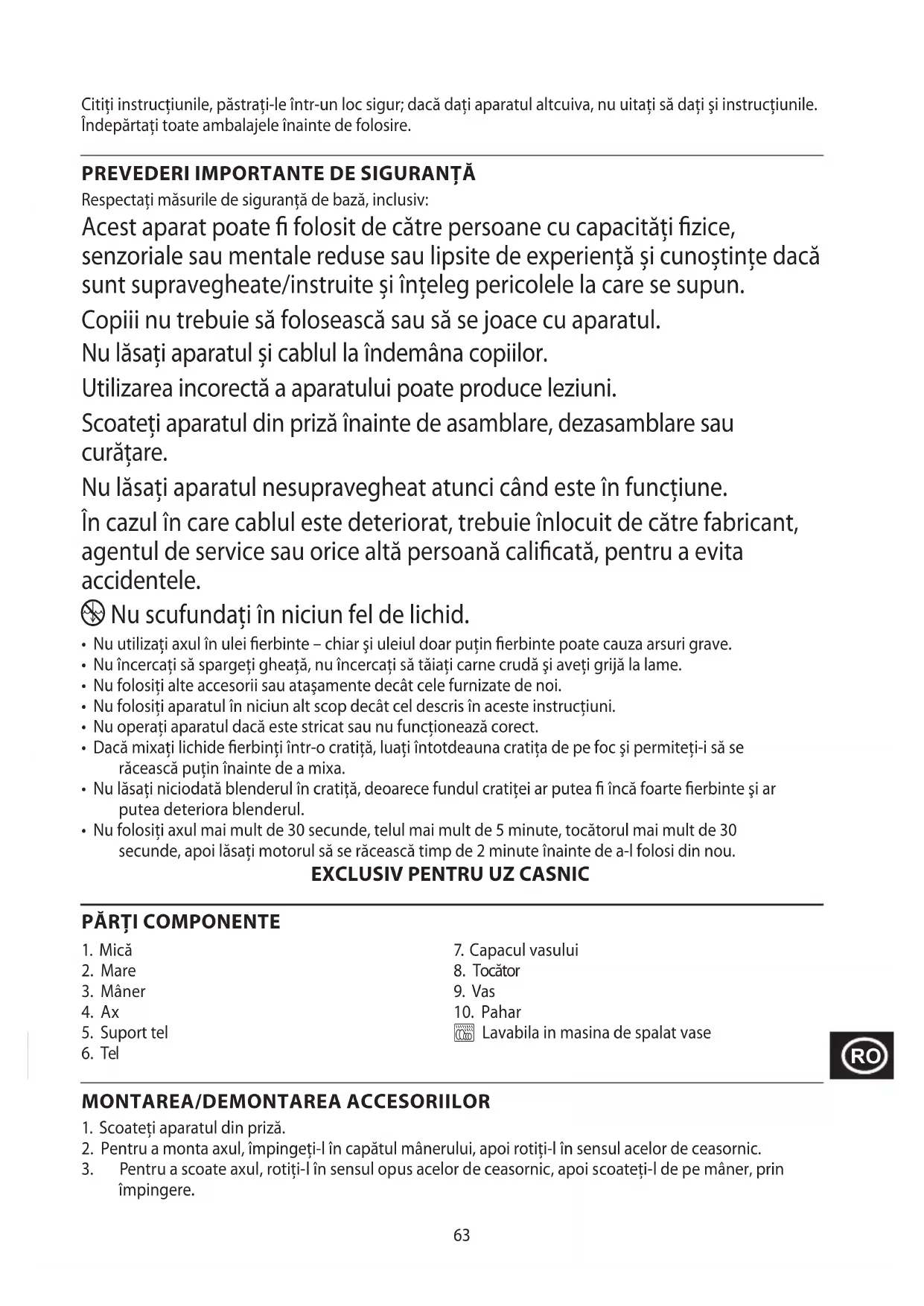 Respectați măsurile de siguranță de bază, inclusiv: Acest aparat poate fi folosit de către persoane cu capacități fizice, senzoriale sau mentale reduse sau lipsite de experiență și cunoștințe dacă sunt supravegheate/instruite și înțeleg pericolele la care se supun. Copiii nu trebuie să folosească sau să se joace cu aparatul. Nu lăsați aparatul și cablul la îndemâna copiilor. Utilizarea incorectă a aparatului poate produce leziuni. Scoateți aparatul din priză înainte de asamblare, dezasamblare sau curățare. Nu lăsați aparatul nesupravegheat atunci când este în funcțiune. În cazul în care cablul este deteriorat, trebuie înlocuit de către fabricant, agentul de service sau orice altă persoană calificată, pentru a evita accidentele. i Nu scufundați în niciun fel de lichid.