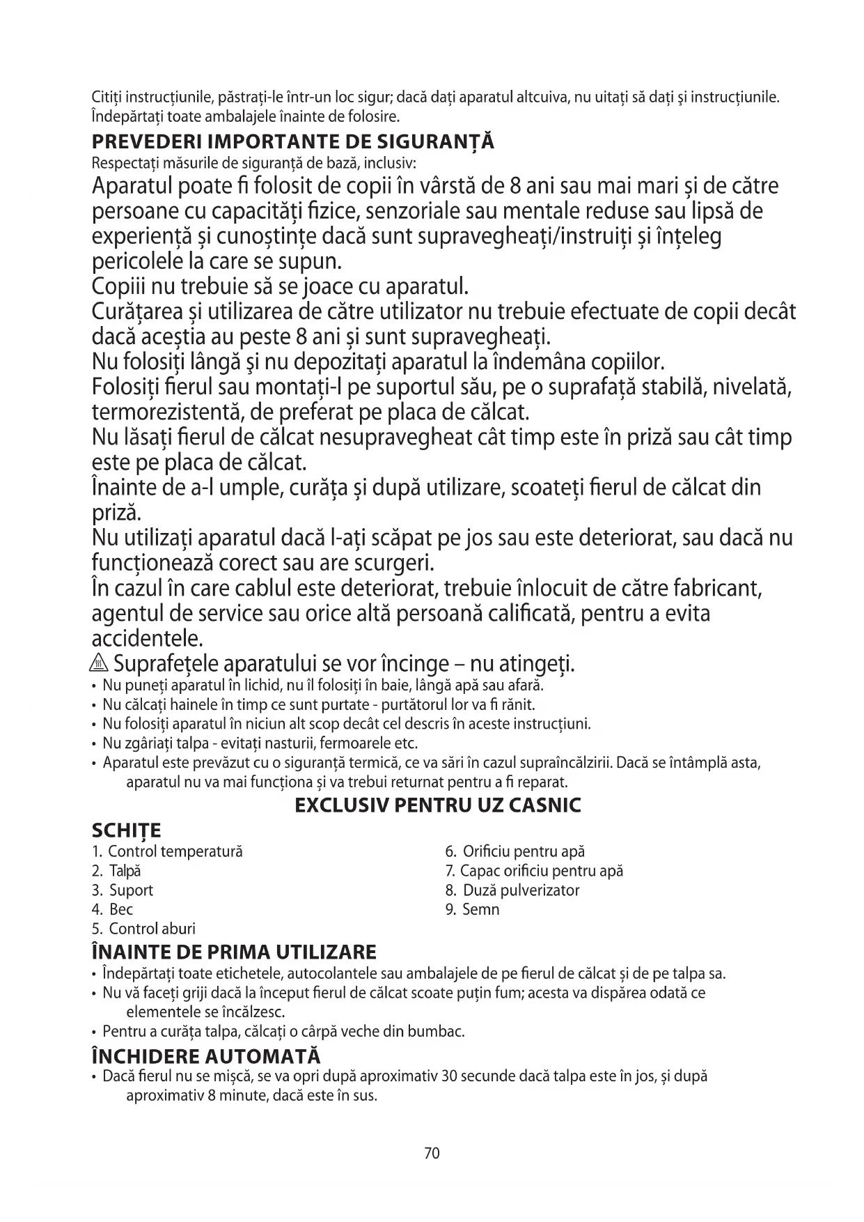Respectați măsurile de siguranță de bază, inclusiv: Aparatul poate fi folosit de copii în vârstă de 8 ani sau mai mari și de către persoane cu capacități fizice, senzoriale sau mentale reduse sau lipsă de experiență și cunoștințe dacă sunt supravegheați/instruiți și înțeleg pericolele la care se supun. Copiii nu trebuie să se joace cu aparatul. Curățarea și utilizarea de către utilizator nu trebuie efectuate de copii decât dacă aceștia au peste 8 ani și sunt supravegheați. Nu folosiți lângă şi nu depozitați aparatul la îndemâna copiilor. Folosiți fierul sau montați-l pe suportul său, pe o suprafață stabilă, nivelată, termorezistentă, de preferat pe placa de călcat. Nu lăsați fierul de călcat nesupravegheat cât timp este în priză sau cât timp este pe placa de călcat. Înainte de a-l umple, curăța și după utilizare, scoateți fierul de călcat din priză. Nu utilizați aparatul dacă l-ați scăpat pe jos sau este deteriorat, sau dacă nu funcționează corect sau are scurgeri. În cazul în care cablul este deteriorat, trebuie înlocuit de către fabricant, agentul de service sau orice altă persoană calificată, pentru a evita accidentele. h Suprafețele aparatului se vor încinge – nu atingeți.