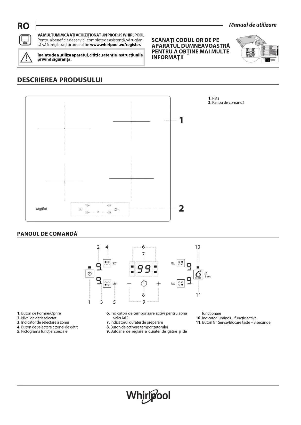 1. Buton de Pornire/Oprire2. Nivel de gătit selectat3. Indicator de selectare a zonei4. Buton de selectare a zonei de gătit5. Pictograma funcției speciale6. Indicatori de temporizare activi pentru zona selectată7. Indicatorul duratei de preparare8. Buton de activare temporizatorului9. Butoane de reglare a duratei de gătire și de funcționare10. Indicator luminos – funcţie activă11. Buton 6 Sense/Blocare taste – 3secundeVĂ MULȚUMIM CĂ AȚI ACHIZIȚIONAT UN PRODUS WHIRLPOOLPentru a benecia de ser vicii complete de asistenţă, vă rugăm să vă înregistrați produsul pe www.whirlpool.eu/register.