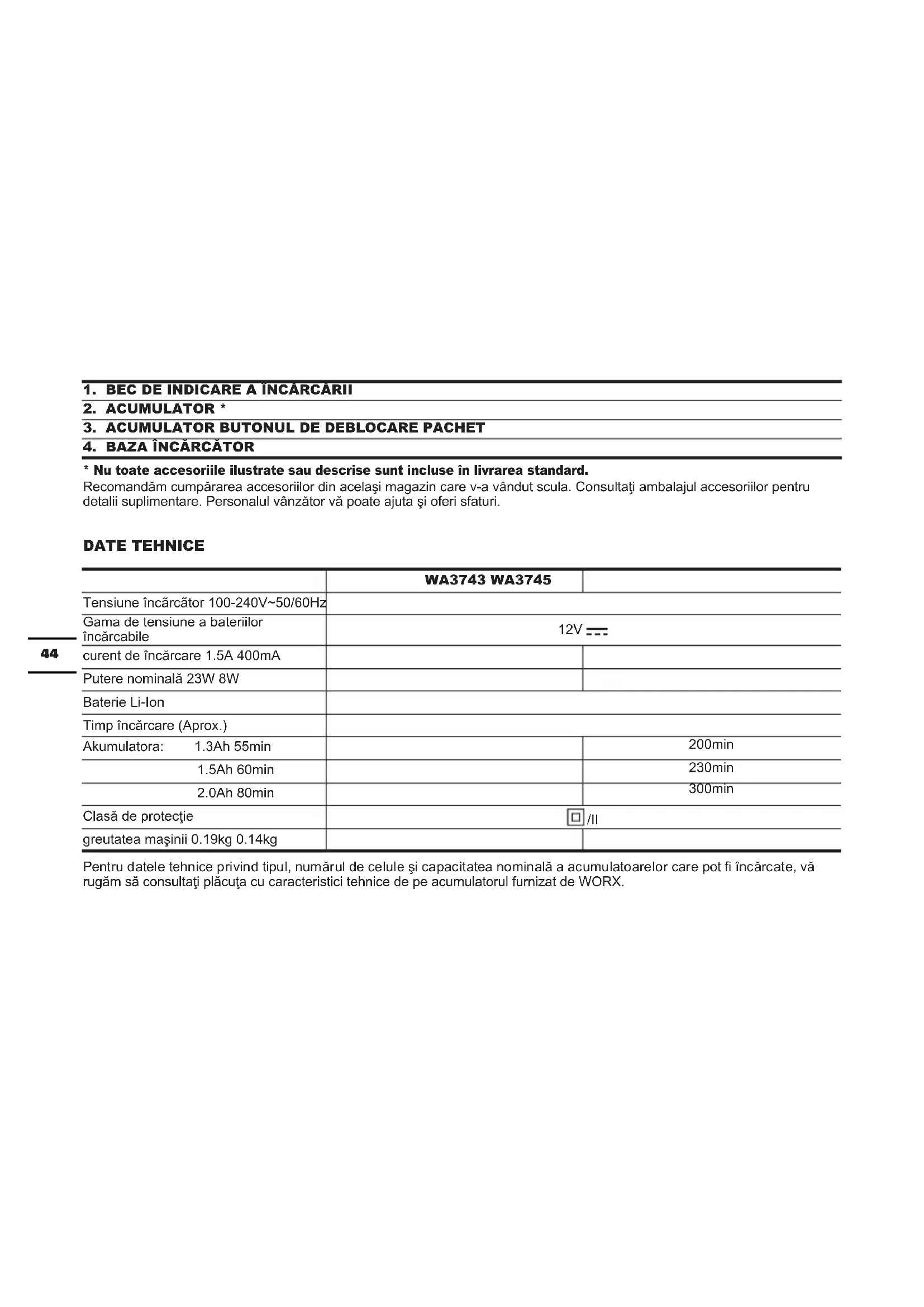 - Nu toate accesoriile ilustrate sau descrise sunt incluse în livrarea standard. Recomandăm cumpărarea accesoriilor din acelaşi magazin care v-a vândut scula. Consultaţi ambalajul accesoriilor pentru detalii suplimentare. Personalul vânzător vă poate ajuta şi oferi sfaturi. DATE TEHNICE WA3743 WA3745 Tensiune încãrcãtor 100-240V~50/60Hz Gama de tensiune a bateriilor încărcabile 12V curent de încărcare 1.5A 400mA Putere nominală 23W 8W Baterie Li-Ion Timp încărcare (Aprox.) Akumulatora: 1.3Ah 55min 200min 1.5Ah 60min 230min 2.0Ah 80min 300min Clasă de protecţie /II greutatea maşinii 0.19kg 0.14kg Pentru datele tehnice privind tipul, numărul de celule şi capacitatea nominală a acumulatoarelor care pot încărcate, vă rugăm să consultaţi plăcuţa cu caracteristici tehnice de pe acumulatorul furnizat de WORX.45