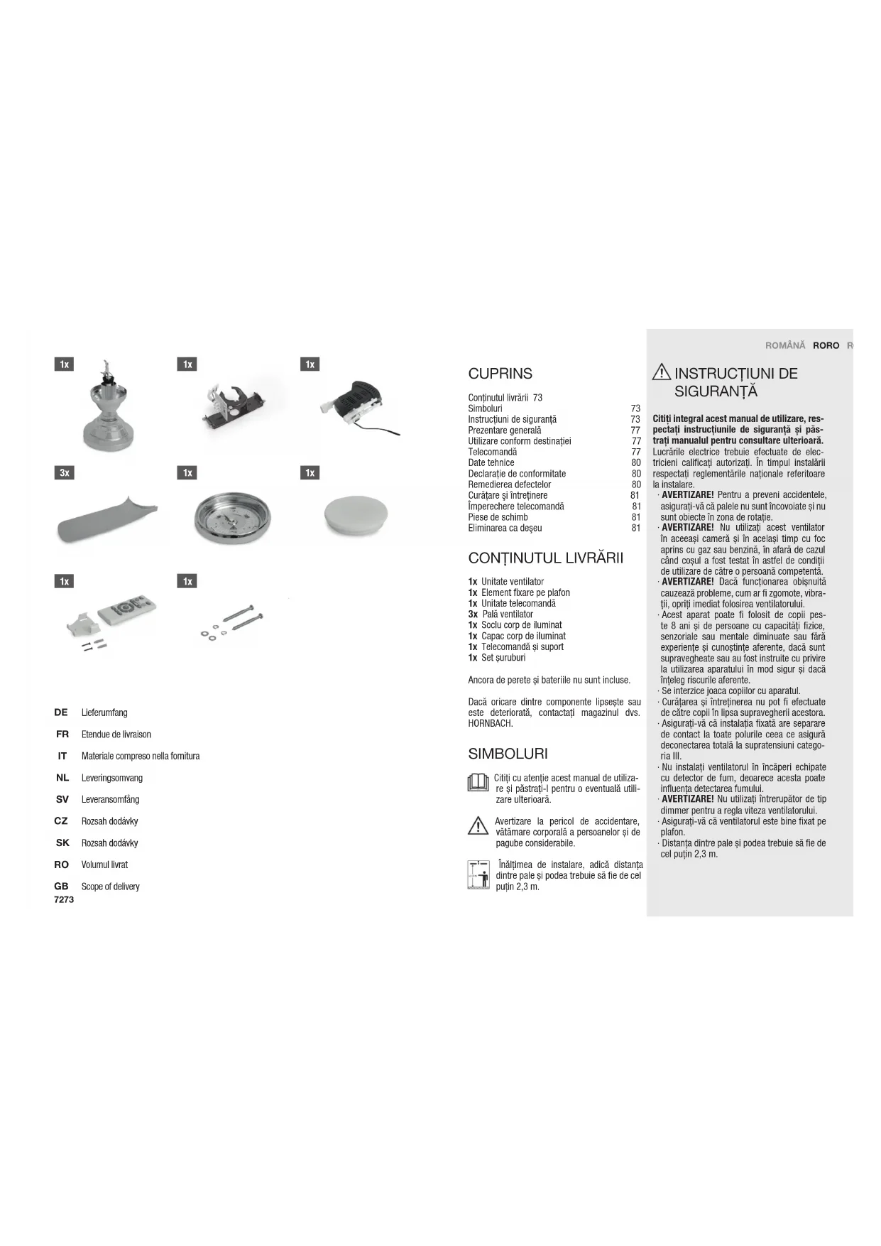 - Distanţa dintre pale și podea trebuie să fie de cel puţin 2,3 m. CUPRINS Conţinutul livrării 73 Simboluri 73 Instrucţiuni de siguranţă 73 Prezentare generală 77 Utilizare conform destinaţiei 77 Telecomandă 77 Date tehnice 80 Declaraţie de conformitate 80 Remedierea defectelor 80 Curăţare şi întreţinere 81 Împerechere telecomandă 81 Piese de schimb 81 Eliminarea ca deşeu 81 Lieferumfang Etendue de livraison Materiale compreso nella fornitura Leveringsomvang Leveransomfång Rozsah dodávky Rozsah dodávky Volumul livrat Scope of delivery