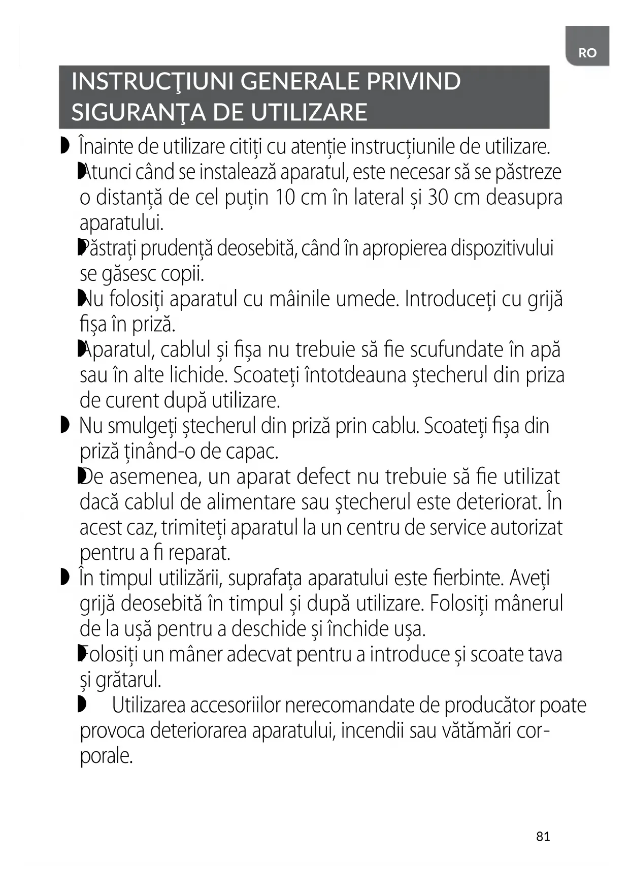 Dispozitivul trebuie conectat la o priză de rețea cu un pin de împământare. Dispozitivul este destinat exclusiv uzului casnic. Echipamentul nu este destinat pentru a funcţiona folosind temporizatoare externe sau un sistem separat de reglare de la distanţă. Aparatul trebuie așezat pe o suprafață rezistentă la căldură. Nu îl așezați pe plastic, vinil, lemn lăcuit sau alte suprafețe realizate din substanțe inflamabile. Prezentul dispozitiv poate fi utilizat de către copii cu vârsta cel puţin 8 ani şi de persoanele cu abilităţi fizice, mentale, senzoriale reduse precum şi persoanele fără experienţă şi cunoaşterea dispozitivului numai dacă este asigurată supra- veghere sau instrucţiunile cu privire la utilizarea dispozitivului în condiţii de siguranţă, astfel încât riscurile asociate sunt înţelese. Copiii nesupravegheați nu trebuie să efectueze curățarea și întreținerea echipamentului.83
