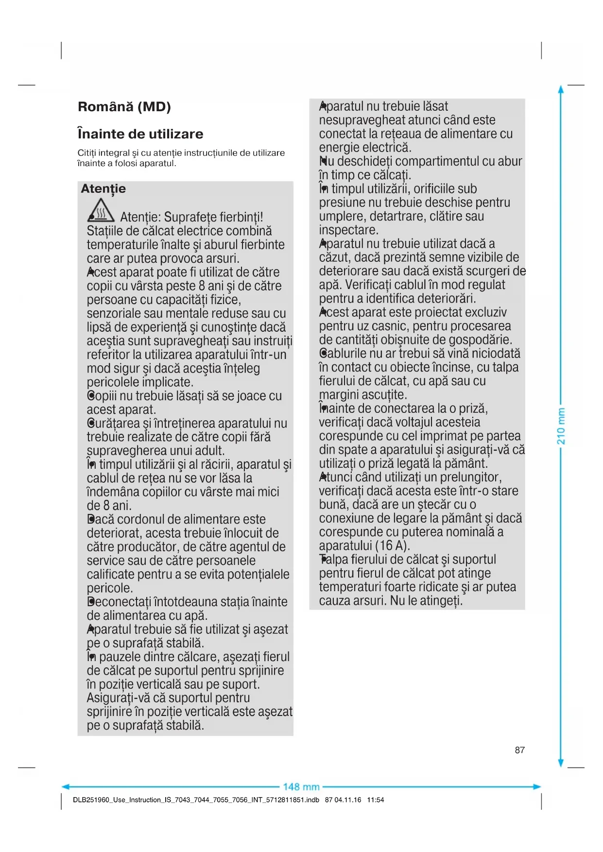 DLB251960_Use_Instruction_IS_7043_7044_7055_7056_INT_5712811851.indb 86 04.11.16 11:54Română (MD) Înainte de utilizare Citiţi integral şi cu atenţie instrucţiunile de utilizare înainte a folosi aparatul. Atenţie