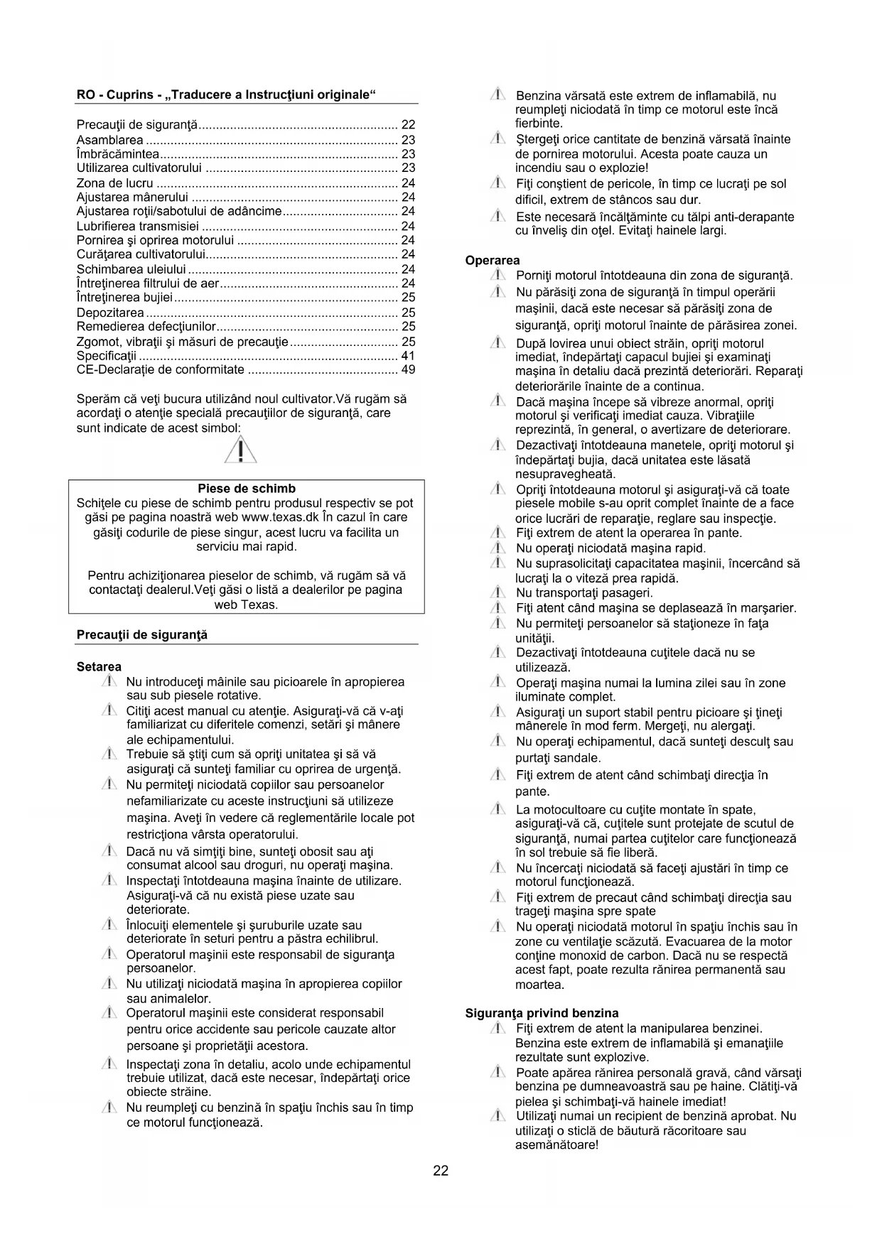 Piese de schimb Schiţele cu piese de schimb pentru produsul respectiv se pot găsi pe pagina noastră web www.texas.dk În cazul în care găsiţi codurile de piese singur, acest lucru va facilita un serviciu mai rapid. Pentru achiziţionarea pieselor de schimb, vă rugăm să vă contactaţi dealerul.Veţi găsi o listă a dealerilor pe pagina web Texas. Precauţii de siguranţă Setarea Nu introduceţi mâinile sau picioarele în apropierea sau sub piesele rotative. Citiţi acest manual cu atenţie. Asiguraţi-vă că v-aţi familiarizat cu diferitele comenzi, setări şi mânere ale echipamentului. Trebuie să ştiţi cum să opriţi unitatea şi să vă asiguraţi că sunteţi familiar cu oprirea de urgenţă. Nu permiteţi niciodată copiilor sau persoanelor nefamiliarizate cu aceste instrucţiuni să utilizeze maşina. Aveţi în vedere că reglementările locale pot restricţiona vârsta operatorului. Dacă nu vă simţiţi bine, sunteţi obosit sau aţi consumat alcool sau droguri, nu operaţi maşina. Inspectaţi întotdeauna maşina înainte de utilizare. Asiguraţi-vă că nu există piese uzate sau deteriorate. Înlocuiţi elementele şi şuruburile uzate sau deteriorate în seturi pentru a păstra echilibrul. Operatorul maşinii este responsabil de siguranţa persoanelor. Nu utilizaţi niciodată maşina în apropierea copiilor sau animalelor. Operatorul maşinii este considerat responsabil pentru orice accidente sau pericole cauzate altor persoane şi proprietăţii acestora. Inspectaţi zona în detaliu, acolo unde echipamentul trebuie utilizat, dacă este necesar, îndepărtaţi orice obiecte străine. Nu reumpleţi cu benzină în spaţiu închis sau în timp ce motorul funcţionează. Benzina vărsată este extrem de inflamabilă, nu reumpleţi niciodată în timp ce motorul este încă fierbinte. Ştergeţi orice cantitate de benzină vărsată înainte de pornirea motorului. Acesta poate cauza un incendiu sau o explozie! Fiţi conştient de pericole, în timp ce lucraţi pe sol dificil, extrem de stâncos sau dur. Este necesară încălţăminte cu tălpi anti-derapante cu înveliş din oţel. Evitaţi hainele largi. Operarea Porniţi motorul întotdeauna din zona de siguranţă. Nu părăsiţi zona de siguranţă în timpul operării maşinii, dacă este necesar să părăsiţi zona de siguranţă, opriţi motorul înainte de părăsirea zonei. După lovirea unui obiect străin, opriţi motorul imediat, îndepărtaţi capacul bujiei şi examinaţi maşina în detaliu dacă prezintă deteriorări. Reparaţi deteriorările înainte de a continua. Dacă maşina începe să vibreze anormal, opriţi motorul şi verificaţi imediat cauza. Vibraţiile reprezintă, în general, o avertizare de deteriorare. Dezactivaţi întotdeauna manetele, opriţi motorul şi îndepărtaţi bujia, dacă unitatea este lăsată nesupravegheată. Opriţi întotdeauna motorul şi asiguraţi-vă că toate piesele mobile s-au oprit complet înainte de a face orice lucrări de reparaţie, reglare sau inspecţie. Fiţi extrem de atent la operarea în pante. Nu operaţi niciodată maşina rapid. Nu suprasolicitaţi capacitatea maşinii, încercând să lucraţi la o viteză prea rapidă. Nu transportaţi pasageri. Fiţi atent când maşina se deplasează în marşarier. Nu permiteţi persoanelor să staţioneze în faţa unităţii. Dezactivaţi întotdeauna cuţitele dacă nu se utilizează. Operaţi maşina numai la lumina zilei sau în zone iluminate complet. Asiguraţi un suport stabil pentru picioare şi ţineţi mânerele în mod ferm. Mergeţi, nu alergaţi. Nu operaţi echipamentul, dacă sunteţi desculţ sau purtaţi sandale. Fiţi extrem de atent când schimbaţi direcţia în pante. La motocultoare cu cuţite montate în spate, asiguraţi-vă că, cuţitele sunt protejate de scutul de siguranţă, numai partea cuţitelor care funcţionează în sol trebuie să fie liberă. Nu încercaţi niciodată să faceţi ajustări în timp ce motorul funcţionează. Fiţi extrem de precaut când schimbaţi direcţia sau trageţi maşina spre spate Nu operaţi niciodată motorul în spaţiu închis sau în zone cu ventilaţie scăzută. Evacuarea de la motor conţine monoxid de carbon. Dacă nu se respectă acest fapt, poate rezulta rănirea permanentă sau moartea. Siguranţa privind benzina Fiţi extrem de atent la manipularea benzinei. Benzina este extrem de inflamabilă şi emanaţiile rezultate sunt explozive. Poate apărea rănirea personală gravă, când vărsaţi benzina pe dumneavoastră sau pe haine. Clătiţi-vă pielea şi schimbaţi-vă hainele imediat! Utilizaţi numai un recipient de benzină aprobat. Nu utilizaţi o sticlă de băutură răcoritoare sau asemănătoare!23