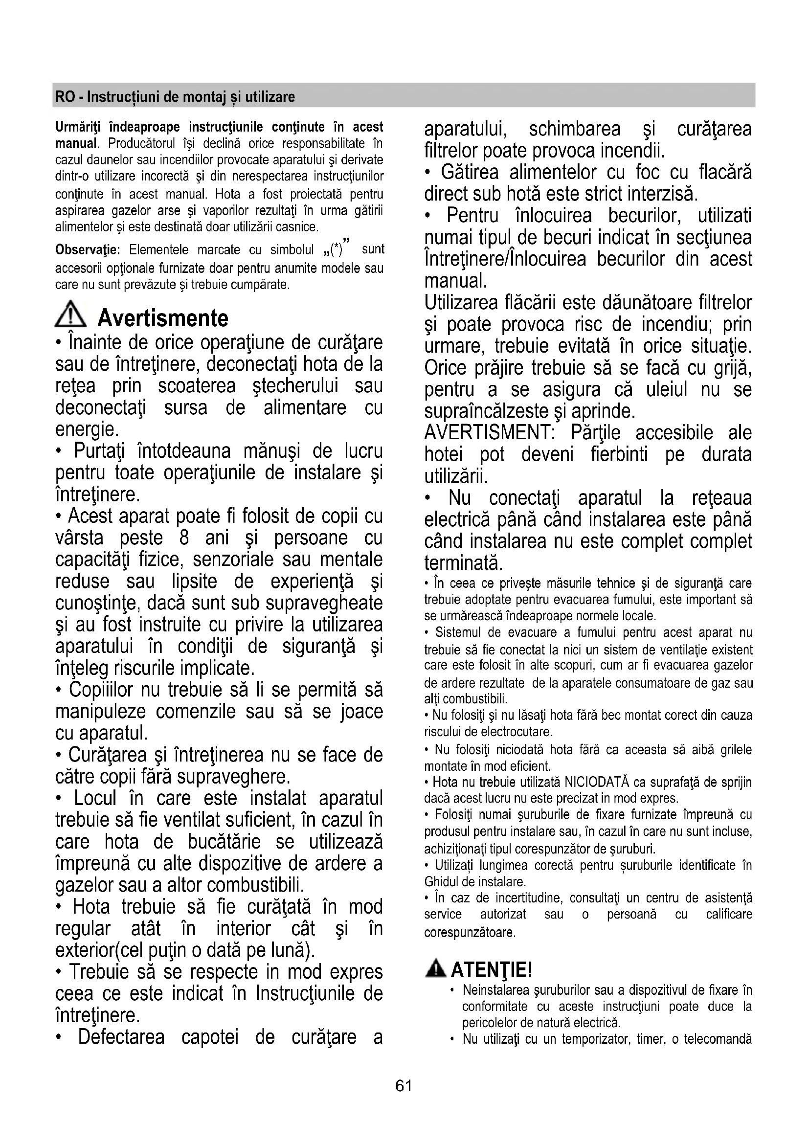 - Locul în care este instalat aparatul trebuie să fie ventilat suficient, în cazul în care hota de bucătărie se utilizează împreună cu alte dispozitive de ardere a gazelor sau a altor combustibili.
