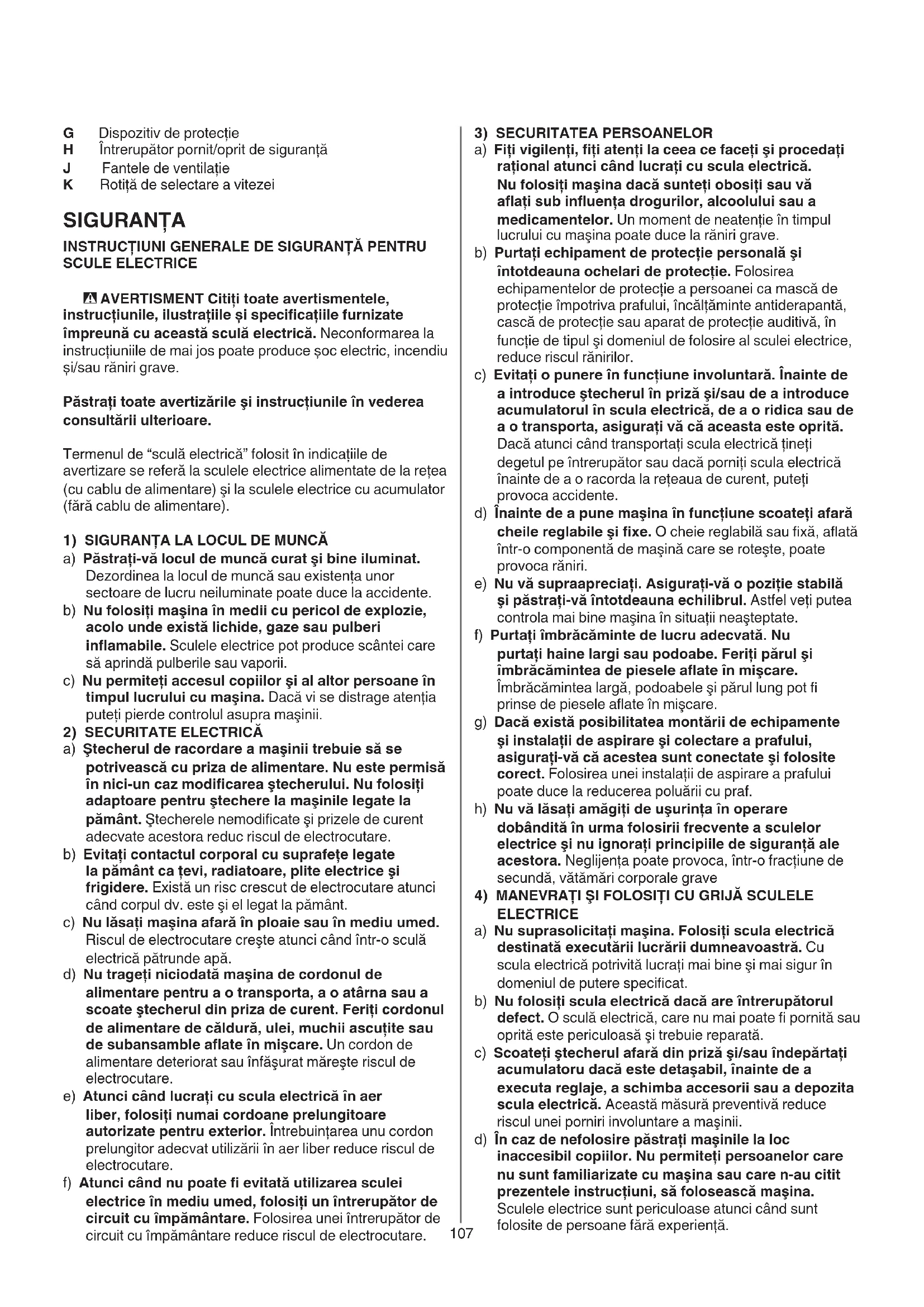 ELECTRICE a) Nu suprasolicitaţi maşina. Folosiţi scula electrică destinată executării lucrării dumneavoastră. Cu scula electrică potrivită lucraţi mai bine şi mai sigur în domeniul de putere specicat. b) Nu folosiţi scula electrică dacă are întrerupătorul defect. O sculă electrică, care nu mai poate pornită sau oprită este periculoasă şi trebuie reparată. c) Scoateţi ştecherul afară din priză şi/sau îndepărtaţi acumulatoru dacă este detaşabil, înainte de a executa reglaje, a schimba accesorii sau a depozita scula electrică. Această măsură preventivă reduce riscul unei porniri involuntare a maşinii. d) În caz de nefolosire păstraţi maşinile la loc inaccesibil copiilor. Nu permiteţi persoanelor care nu sunt familiarizate cu maşina sau care n-au citit prezentele instrucţiuni, să folosească maşina. Sculele electrice sunt periculoase atunci când sunt folosite de persoane fără experienţă. G Dispozitiv de protecţie H Întrerupător pornit/oprit de siguranţă J Fantele de ventilaţie K Rotiţă de selectare a vitezei SIGURANŢA