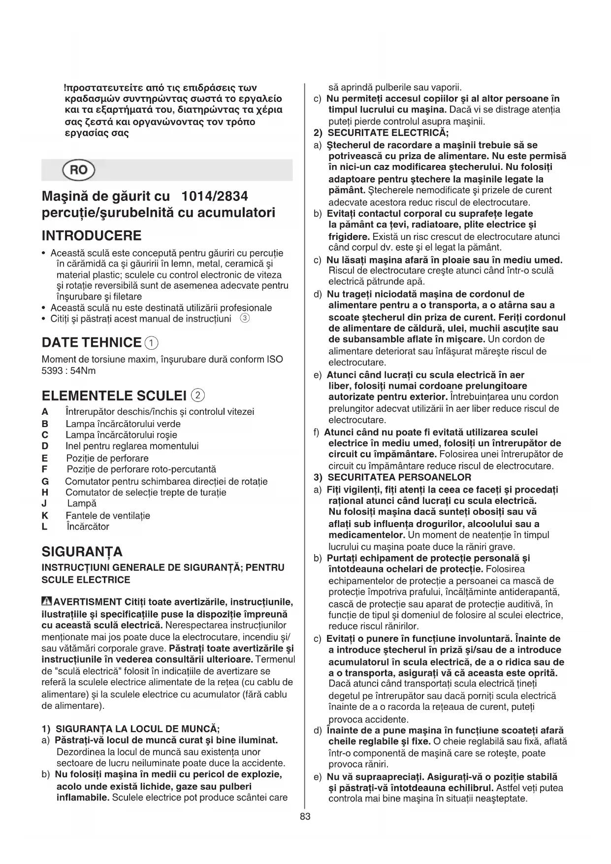 a) Fiţi vigilenţi, ţi atenţi la ceea ce faceţi şi procedaţi raţional atunci când lucraţi cu scula electrică. Nu folosiţi maşina dacă sunteţi obosiţi sau vă aaţi sub inuenţa drogurilor, alcoolului sau a medicamentelor. Un moment de neatenţie în timpul lucrului cu maşina poate duce la răniri grave. b) Purtaţi echipament de protecţie personală şi întotdeauna ochelari de protecţie. Folosirea echipamentelor de protecţie a persoanei ca mască de protecţie împotriva prafului, încălţăminte antiderapantă, cască de protecţie sau aparat de protecţie auditivă, în funcţie de tipul şi domeniul de folosire al sculei electrice, reduce riscul rănirilor. c) Evitaţi o punere în funcţiune involuntară. Înainte de a introduce ştecherul în priză şi/sau de a introduce acumulatorul în scula electrică, de a o ridica sau de a o transporta, asiguraţi vă că aceasta este oprită. Dacă atunci când transportaţi scula electrică ţineţi degetul pe întrerupător sau dacă porniţi scula electrică înainte de a o racorda la reţeaua de curent, puteţi provoca accidente. d) Înainte de a pune maşina în funcţiune scoateţi afară cheile reglabile şi xe. O cheie reglabilă sau xă, aată într-o componentă de maşină care se roteşte, poate provoca răniri. e) Nu vă supraapreciaţi. Asiguraţi-vă o poziţie stabilă şi păstraţi-vă întotdeauna echilibrul. Astfel veţi putea controla mai bine maşina în situaţii neaşteptate. ! προστατευτείτε από τις επιδράσεις των κραδασμών συντηρώντας σωστά το εργαλείο και τα εξαρτήματά του, διατηρώντας τα χέρια σας ζεστά και οργανώνοντας τον τρόπο εργασίας σας Maşină de găurit cu 1014/2834 percuţie/şurubelnită cu acumulatori INTRODUCERE