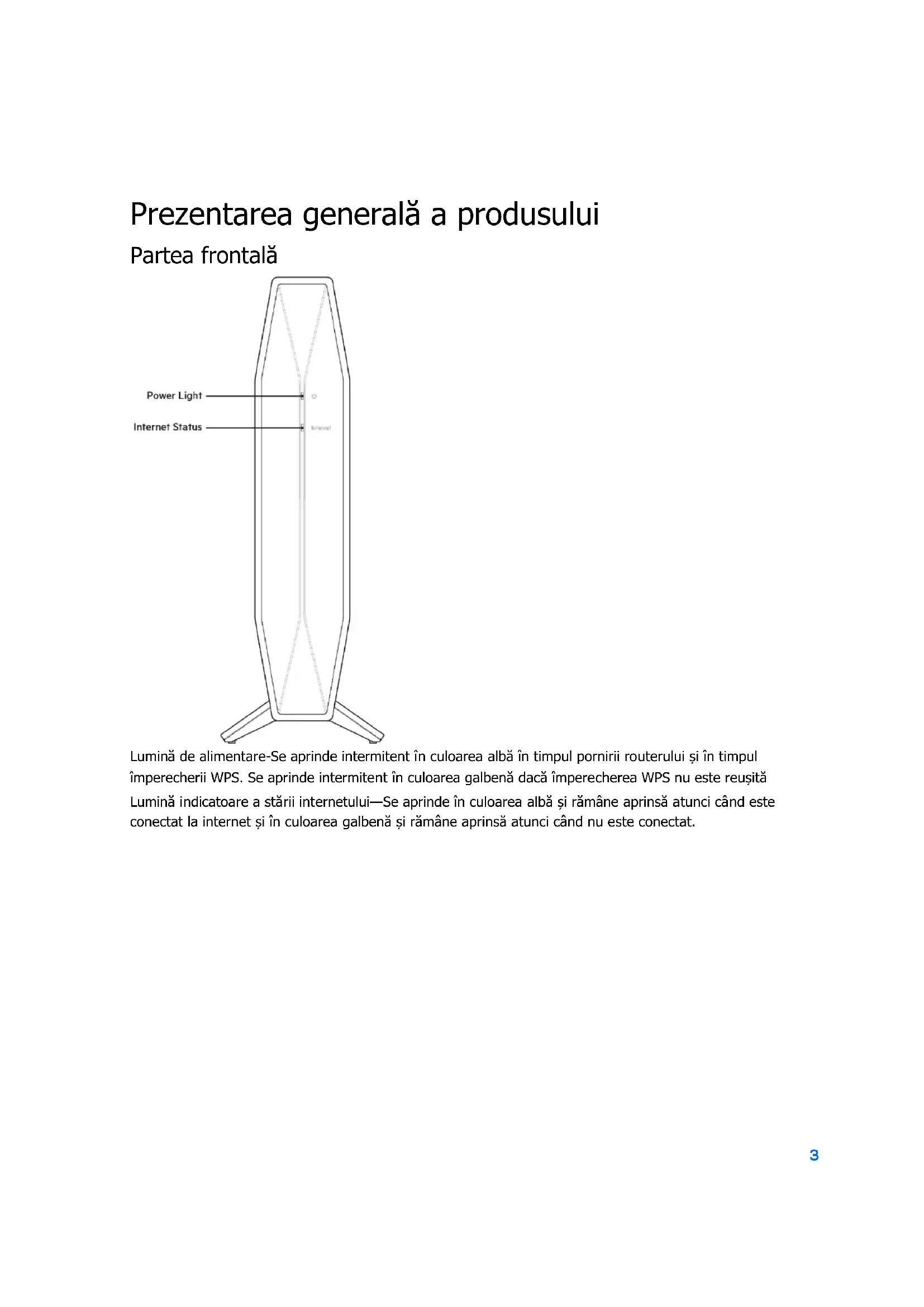 - Cerințe de mediu Prezentarea generală a produsului Partea frontală Lumină de alimentare-Se aprinde intermitent în culoarea albă în timpul pornirii routerului și în timpul împerecherii WPS. Se aprinde intermitent în culoarea galbenă dacă împerecherea WPS nu este reușită Lumină indicatoare a stării internetului—Se aprinde în culoarea albă și rămâne aprinsă atunci când este conectat la internet și în culoarea galbenă și rămâne aprinsă atunci când nu este conectat.4 Spate Butonul Wi-Fi Protected Setup™ (WPS) (1)—Acționați pentru a facilita configurarea securității wireless pe dispozitive de rețea bazate pe Wi-Fi Protected Setup. Lumina de sub buton se va aprinde intermitent în timp ce este activă asocierea WPS. Butonul Reset (Resetare) (2)—Apăsați continuu acest buton până când ledul de alimentare începe să ilumineze intermitent pentru a reseta routerul la setările implicite din fabrică. Porturile Ethernet (3)– Conectați cablurile Ethernet (numite și cabluri de rețea sau cabluri de internet) la aceste porturi Fast Ethernet (10/100/1000) și la alte dispozitive de rețea cu cablu din rețeaua dumneavoastră. Luminile de sub porturi se vor aprinde numai atunci când un cablu Ethernet este conectat și există trafic de date pe cablu. Portul Internet (4)—Conectați un cablu de Ethernet la acest port și la modemul dumneavoastră. Lumina de sub port se va aprinde numai atunci când un cablu Ethernet este conectat și există trafic de date pe cablu. Portul USB 3.0 (5)—Conectați și partajați un mediu de stocare USB în rețeaua dvs. Portul de alimentare electrică (6)—Conectați adaptorul de alimentare CA inclus la acest port. Întrerupătorul electric (7)—Apăsați pe | (pornire) pentru a porni routerul.5 Instalarea: aspectele de bază Unde puteți găsi ajutor suplimentar Pe lângă acest ghid de utilizare, puteți găsi ajutor și la Belkin.com/support/RT1800 (documentație, descărcări, întrebări frecvente, asistență tehnică, chat în timp real, forumuri) Notă—Licențele și notificările pentru software-urile terțe utilizate pentru acest produs pot fi vizualizate la https://www.belkin.com/support/license/ . Contactați https://www.belkin.com/support/gplcodecenter/ pentru întrebări sau solicitări legate de coduri sursă GPL. Modul de instalare a routerului Adăugați acest router la rețeaua Wi-Fi existentă? Dacă ați mai folosit acest router înainte, resetați-l la setările din fabrică înainte de a-l adăuga în rețeaua Wi-Fi. Puteți face acest lucru din fila de Administrarea setărilor routerului sau apăsând și ținând apăsat timp de 10 secunde butonul de resetare, situat în partea din spate a routerului. p. 203
