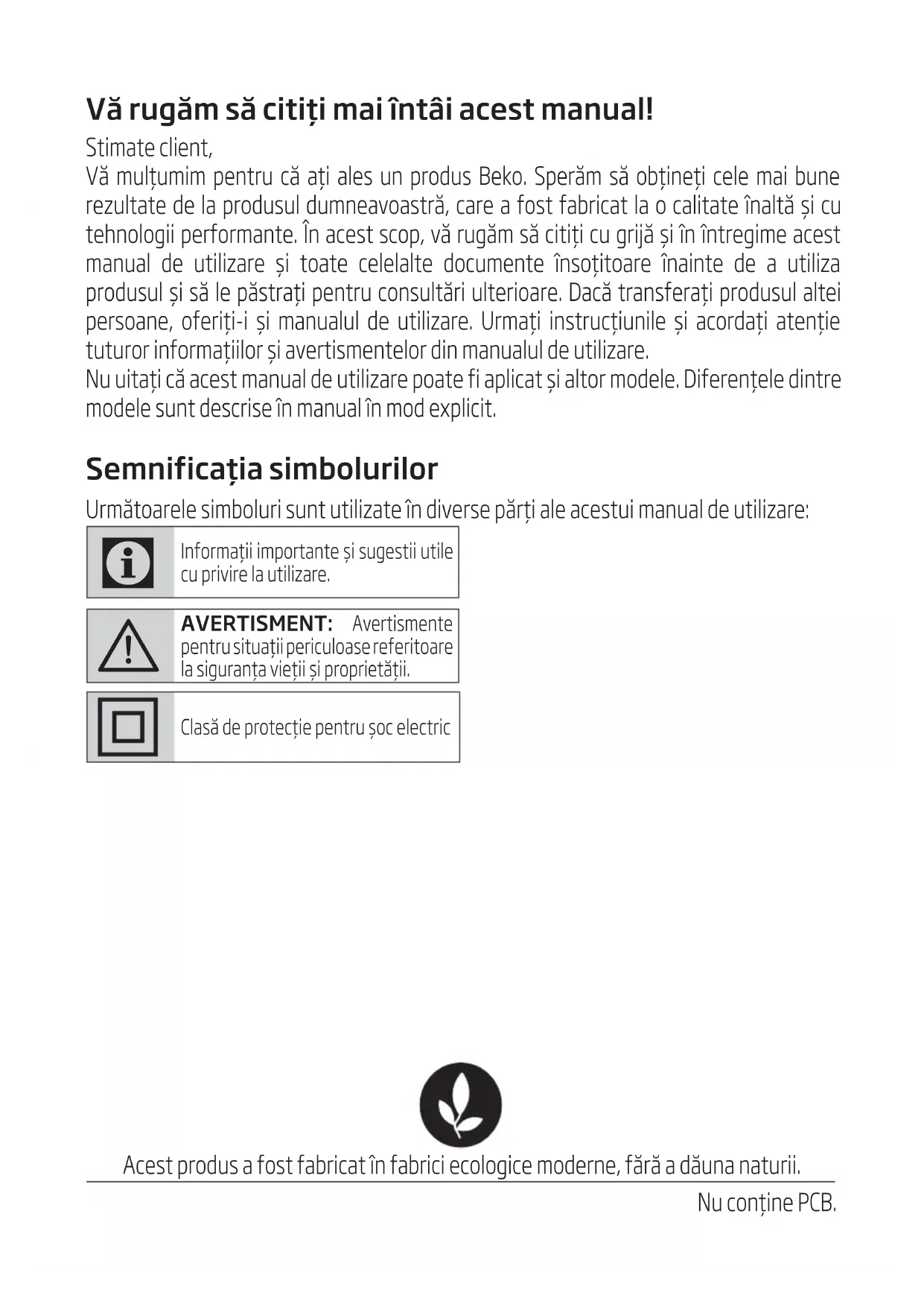 - Ha leejti a készüléket, azzal működésképtelenné teheti vagy maradandó károsodást okozhat. 4 Tisztítás és ápolásVă rugăm să citiți mai întâi acest manual! Stimate client, Vă mulțumim pentru că ați ales un produs Beko. Sperăm să obțineți cele mai bune rezultate de la produsul dumneavoastră, care a fost fabricat la o calitate înaltă și cu tehnologii performante. În acest scop, vă rugăm să citiți cu grijă și în întregime acest manual de utilizare și toate celelalte documente însoțitoare înainte de a utiliza produsul și să le păstrați pentru consultări ulterioare. Dacă transferați produsul altei persoane, oferiți-i și manualul de utilizare. Urmați instrucțiunile și acordați atenție tuturor informațiilor și avertismentelor din manualul de utilizare. Nu uitați că acest manual de utilizare poate fi aplicat și altor modele. Diferențele dintre modele sunt descrise în manual în mod explicit. Semnificația simbolurilor Următoarele simboluri sunt utilizate în diverse părți ale acestui manual de utilizare: