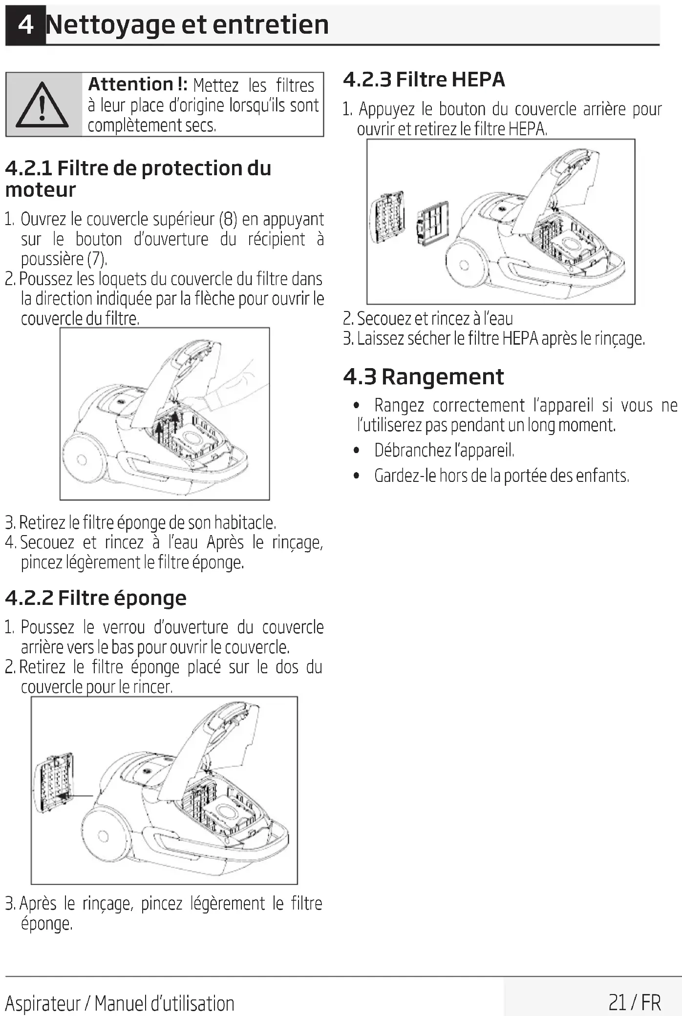 AVERTISMENT: Nu montați filtrele la loc dacă nu sunt uscate complet; în caz contrar, un miros de umezeală se poate resimți în aer, poate țâșni apă din partea din spate sau se pot deteriora filtrele.30 / RO Aspirator / Manual de utilizare