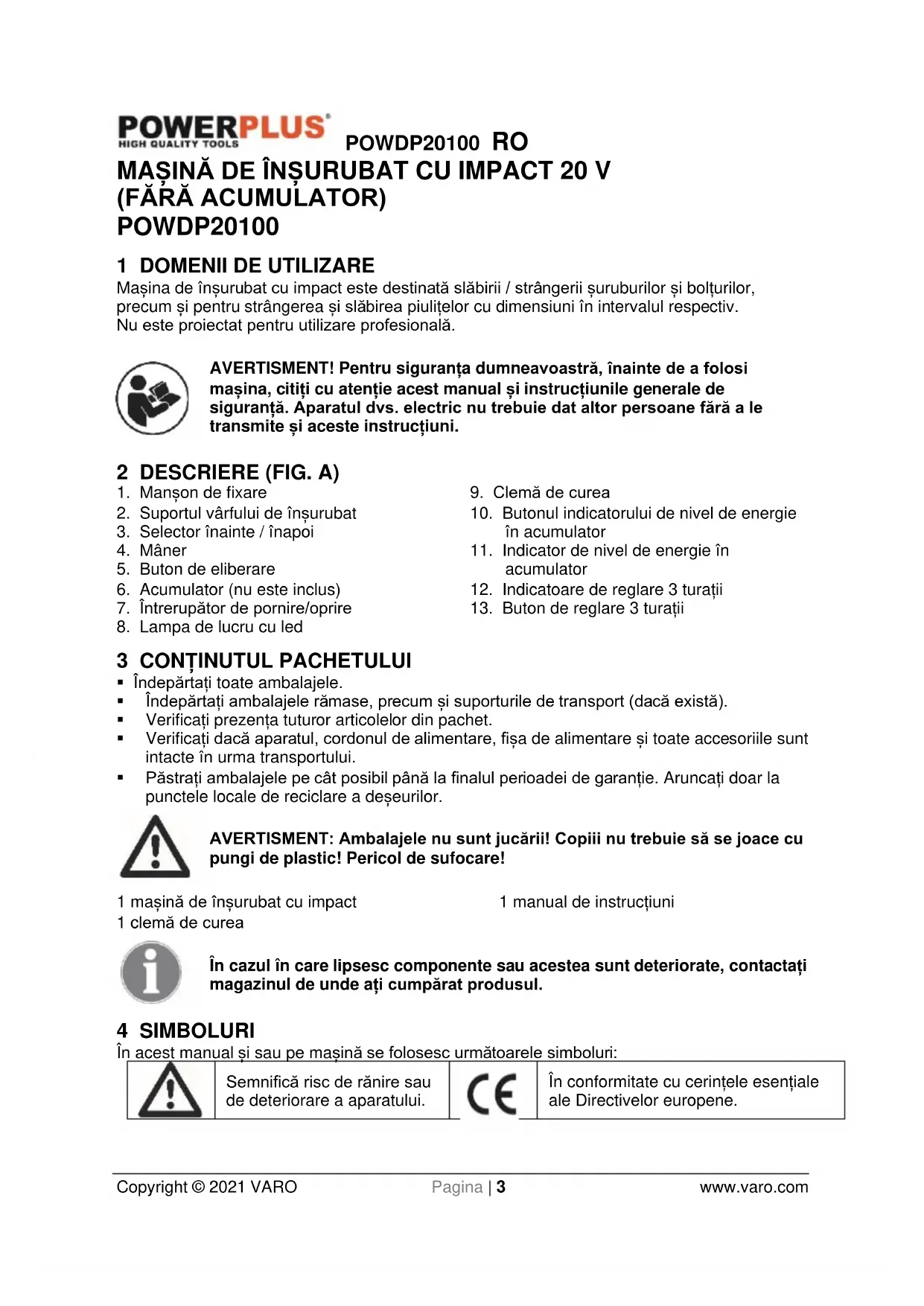 VARO – Vic. Van Rompuy N.V. - Joseph Van Instraat 9 - BE2500 Lier - BELGIA, declară că produsul: Mașină de înșurubat cu impact 20 V - Cu acumulator marcă de comerț: PowerPlus model: POWDP20100 este în conformitate cu specificațiile esențiale și alte prevederi relevante ale Directivelor Europene aplicabile, pe baza aplicării standardelor europene armonizate. Orice modificare neautorizată a aparatelor atrage după sine anularea acestei declarații. Directivele europene (inclusiv, dacă este cazul, amendamentele lor, până la data semnăturii): 2011/65/EU 2006/42/CE 2014/30/EU Standardele europene armonizate (inclusiv, dacă este cazul, amendamentele lor, până la data semnăturii): EN62841-1 : 2015 EN62841-2-2 : 2014 EN55014-1 : 2017 EN55014-2 : 2015 Subsemnatul acționează în numele Directorului general executiv al societății, Ludo Mertens Divizia de reglementare - Manager de conformitate 24/03/2021, Lier - BelgiumPOWDP2010 PL Copyright © 2021 VARO Strona | 1 www.varo.com 1 ZASTOSOWANIE ........................................................................... 3