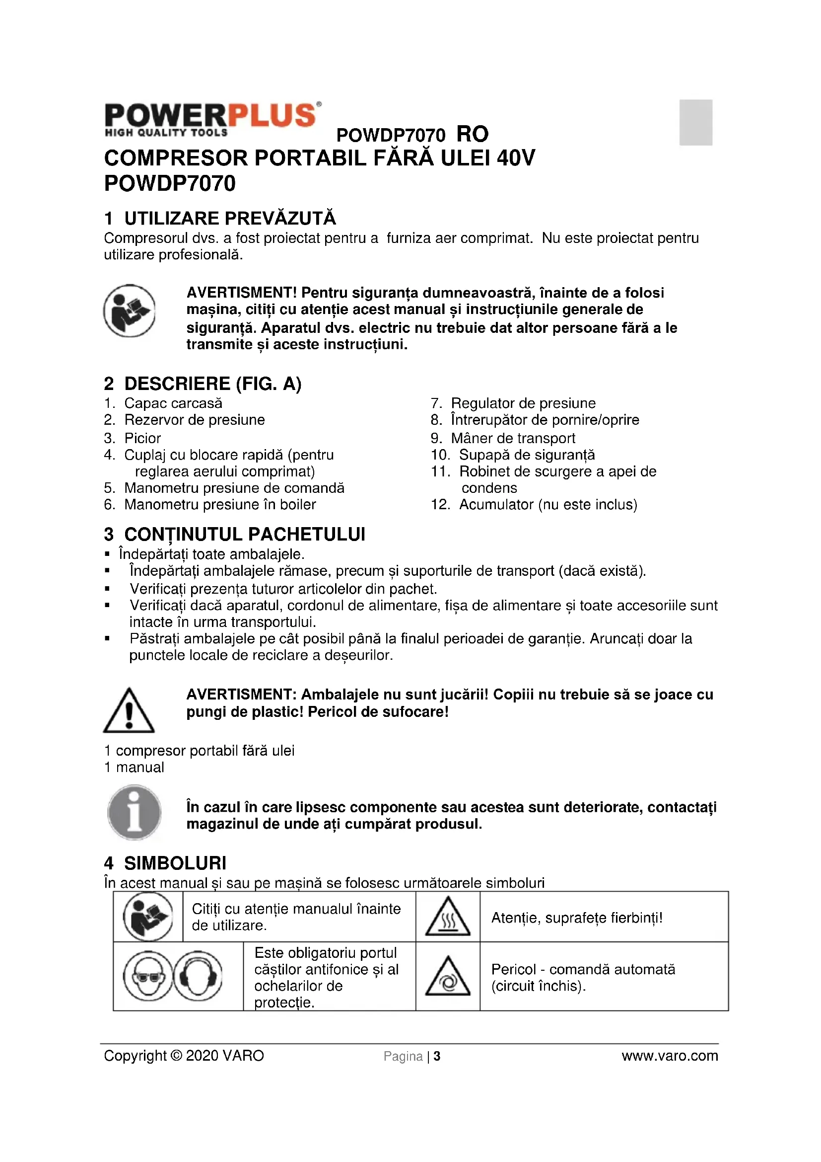 Compresorul dvs. a fost proiectat pentru a furniza aer comprimat. Nu este proiectat pentruutilizare profesională.