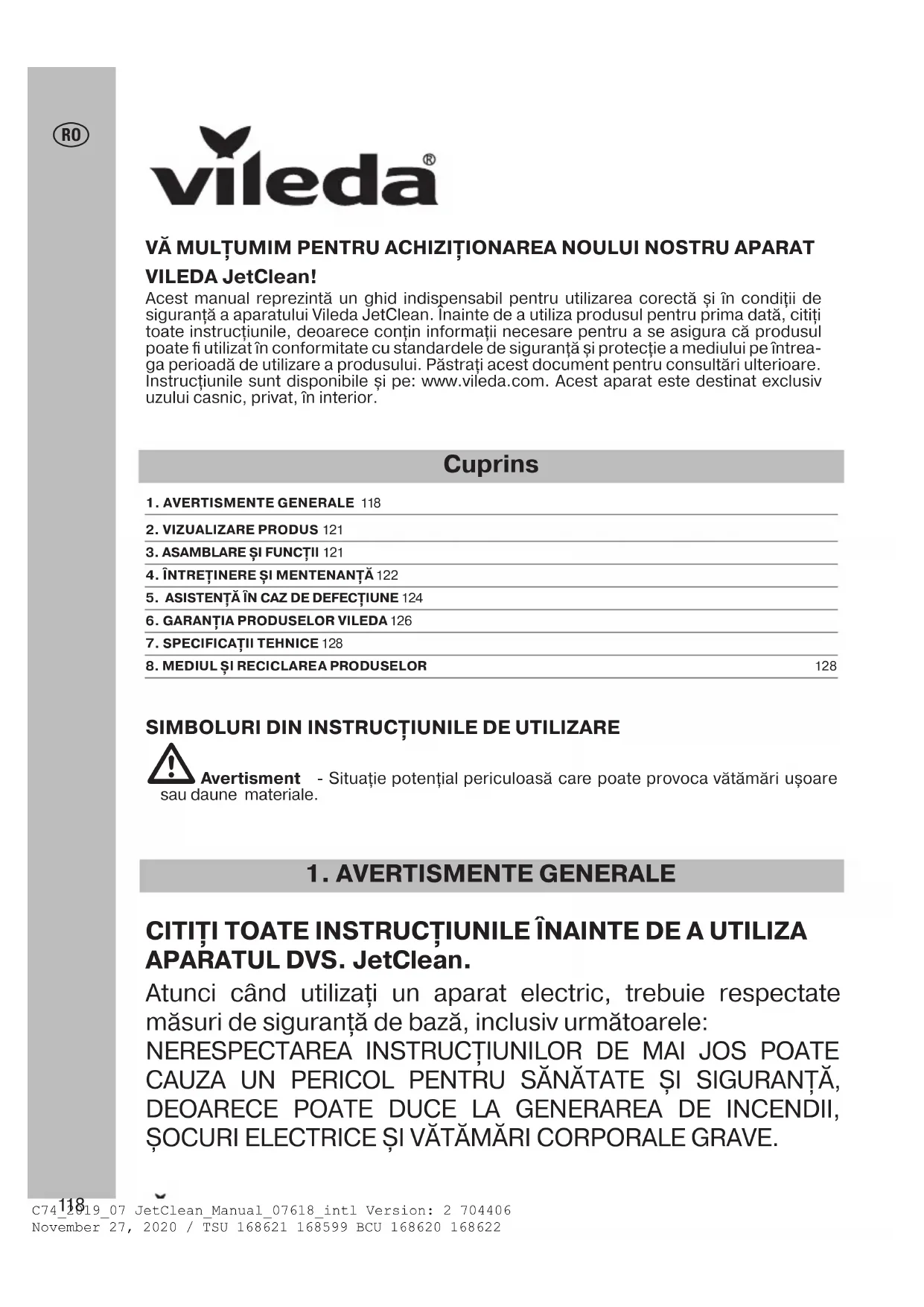 CITIȚI TOATE INSTRUCȚIUNILE ÎNAINTE DE A UTILIZA APARATUL DVS. JetClean. Atunci când utilizați un aparat electric, trebuie respectate măsuri de siguranță de bază, inclusiv următoarele: NERESPECTAREA INSTRUCȚIUNILOR DE MAI JOS POATE CAUZA UN PERICOL PENTRU SĂNĂTATE ȘI SIGURANȚĂ, DEOARECE POATE DUCE LA GENERAREA DE INCENDII, ȘOCURI ELECTRICE ȘI VĂTĂMĂRI CORPORALE GRAVE. VĂ MULȚUMIM PENTRU ACHIZIȚIONAREA NOULUI NOSTRU APARAT VILEDA JetClean! Acest manual reprezintă un ghid indispensabil pentru utilizarea corectă și în condiții de siguranță a aparatului Vileda JetClean. Înainte de a utiliza produsul pentru prima dată, citiți toate instrucțiunile, deoarece conțin informații necesare pentru a se asigura că produsul poate fi utilizat în conformitate cu standardele de siguranță și protecție a mediului pe întrea-ga perioadă de utilizare a produsului. Păstrați acest document pentru consultări ulterioare. Instrucțiunile sunt disponibile și pe: www.vileda.com. Acest aparat este destinat exclusiv uzului casnic, privat, în interior. Cuprins 1. AVERTISMENTE GENERALE 1182. VIZUALIZARE PRODUS 1213. ASAMBLARE ȘI FUNCȚII 1214. ÎNTREȚINERE ȘI MENTENANȚĂ 12 25. ASISTENȚĂ ÎN CAZ DE DEFECȚIUNE 1246. GARANȚIA PRODUSELOR VILEDA 12 67. SPECIFICAȚII TEHNICE 128