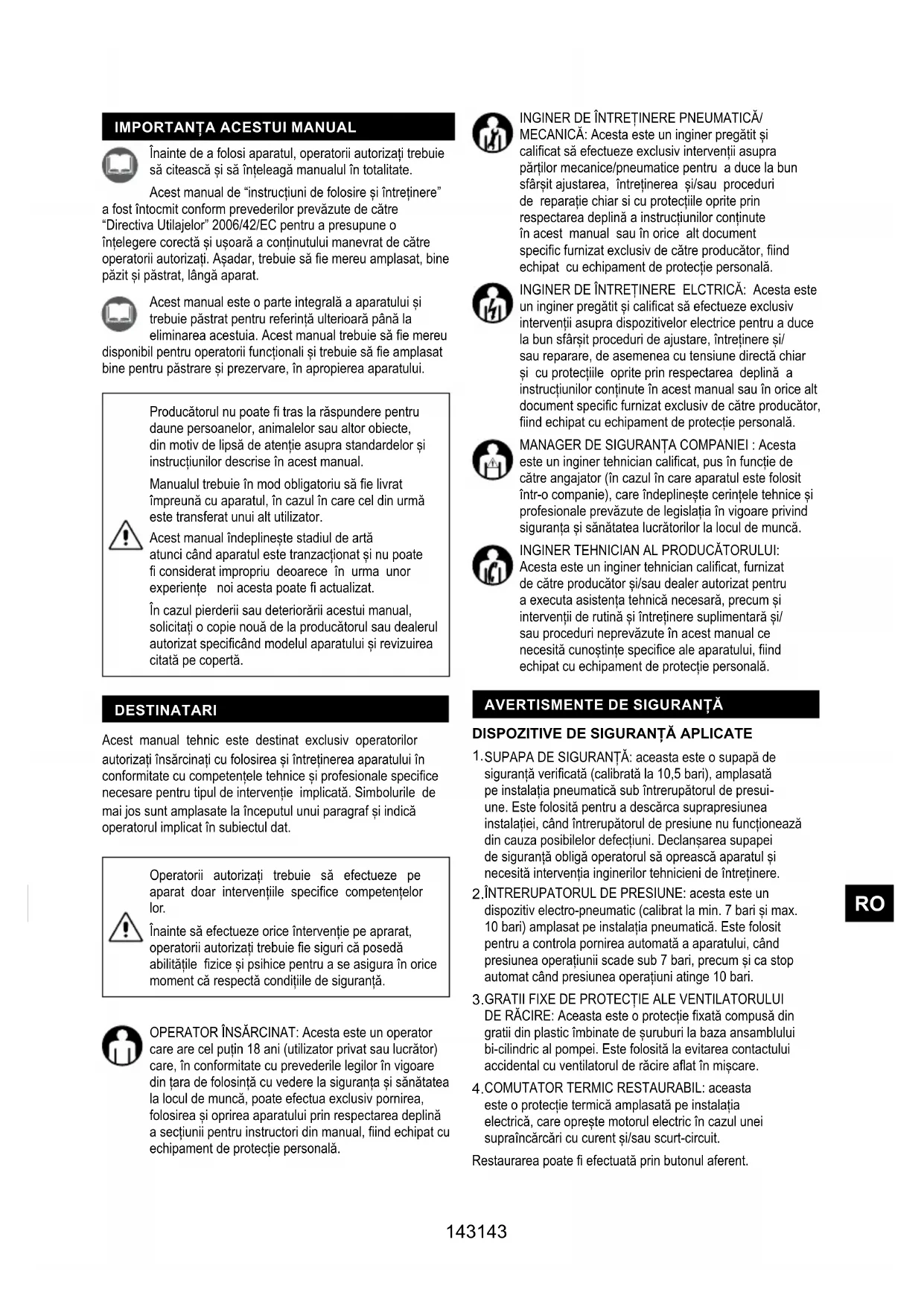 UTILIZAREA PREVĂZUTĂ Comprimarea aerului (fără ulei) pentru folosirea uneltelor pneumatice corespunzătoare in conformitate cu regulile în vigoare (ex: pistoale pentru suat, umare, spălare, vopsire sau sablare; înstalatori sau sudori la fața locului, fochiști sau nituiști. Este strict interzisă manipularea, deconectarea și/ sau demontarea oricărui dispozitiv de siguranță aat în aparat. Este strict interzisă înlocuirea oricărui dispozitiv de siguranță sau a oricărui component al lor cu piese inautentice. Este obligatoriu să vericați constant operațiunea corectă a tuturor dispozitivelor de siguranță instalate pe aparat. Este obligatoriu să înlocuiți imediat orice dispozitiv de siguranță defectuos și/sau deteriorat. Este obligatoriu să tineți semnalul de siguranță curat pentru a asigura buna vizibilitate. Este absolut interzis să eliminați si/sau să deteriorați semnalele de siguranță aplicate pe aparat. Este obligatoriu să înlocuiți semnalele de siguranță uzate solicitându-le producătorului și/sau dealerului autorizat. Operatorilor autorizați nu le este permis să poarte haine și accesorii care pot rămâne prinse în aparat. Este obligatoriu să folosiți EPP prevăzut de producător. Operatorii autorizați sunt obligați să folosească EPP prevăzut de către producători al uneltelor folosite și în conformitate cu tipul de procesare. 144144RO