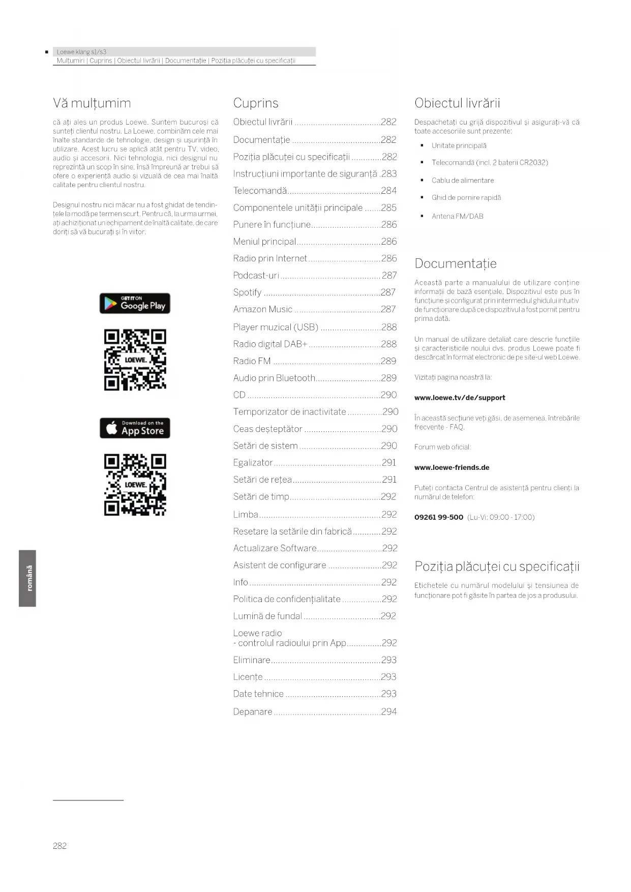 - Loewe klang s1/s3 deutsch română Mulțumiri | Cuprins | Obiectul livrării | Documentație | Poziția plăcuței cu specicații Vă mulțumim că ați ales un produs Loewe. Suntem bucuroși că sunteți clientul nostru. La Loewe, combinăm cele mai înalte standarde de tehnologie, design și ușurință în utilizare. Acest lucru se aplică atât pentru TV, video, audio și accesorii. Nici tehnologia, nici designul nu reprezintă un scop în sine, însă împreună ar trebui să ofere o experiență audio și vizuală de cea mai înaltă calitate pentru clientul nostru. Designul nostru nici măcar nu a fost ghidat de tendin- țele la modă pe termen scurt. Pentru că, la urma urmei, ați achiziționat un echipament de înaltă calitate, de care doriți să vă bucurați și în viitor. Cuprins Obiectul livrării p. 282