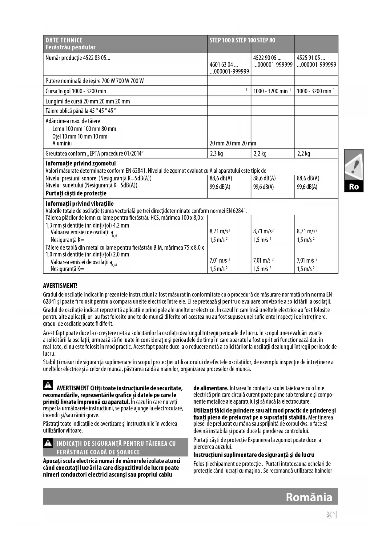 Lungimi de cursă 20 mm 20 mm 20 mm Tăiere oblică până la 45 ° 45 ° 45 ° Adâncimea max. de tăiere Lemn 100 mm 100 mm 80 mm Oţel 10 mm 10 mm 10 mm Aluminiu 20 mm 20 mm 20 mm Greutatea conform „EPTA procedure 01/2014“ 2,3 kg 2,2 kg 2,2 kg Informaţie privind zgomotul Valori măsurate determinate conform EN 62841. Nivelul de zgomot evaluat cu A al aparatului este tipic de Nivelul presiunii sonore (Nesiguranţă K=5dB(A)) Nivelul sunetului (Nesiguranţă K=5dB(A)) Purtaţi căşti de protecţie 88,6 dB(A) 99,6 dB(A) 88,6 dB(A) 99,6 dB(A) 88,6 dB(A) 99,6 dB(A) Informaţii privind vibraţiile Valorile totale de oscilaţie (suma vectorială pe trei direcţideterminate conform normei EN 62841. Tăierea plăcilor de lemn cu lame pentru erăstrău HCS, mărimea 100 x 8,0 x 1,3 mm și dentiție (nr. dinți/țol) 4,2 mm Valoarea emisiei de oscilaţii a h, B Nesiguranţă K= 8,71 m/s