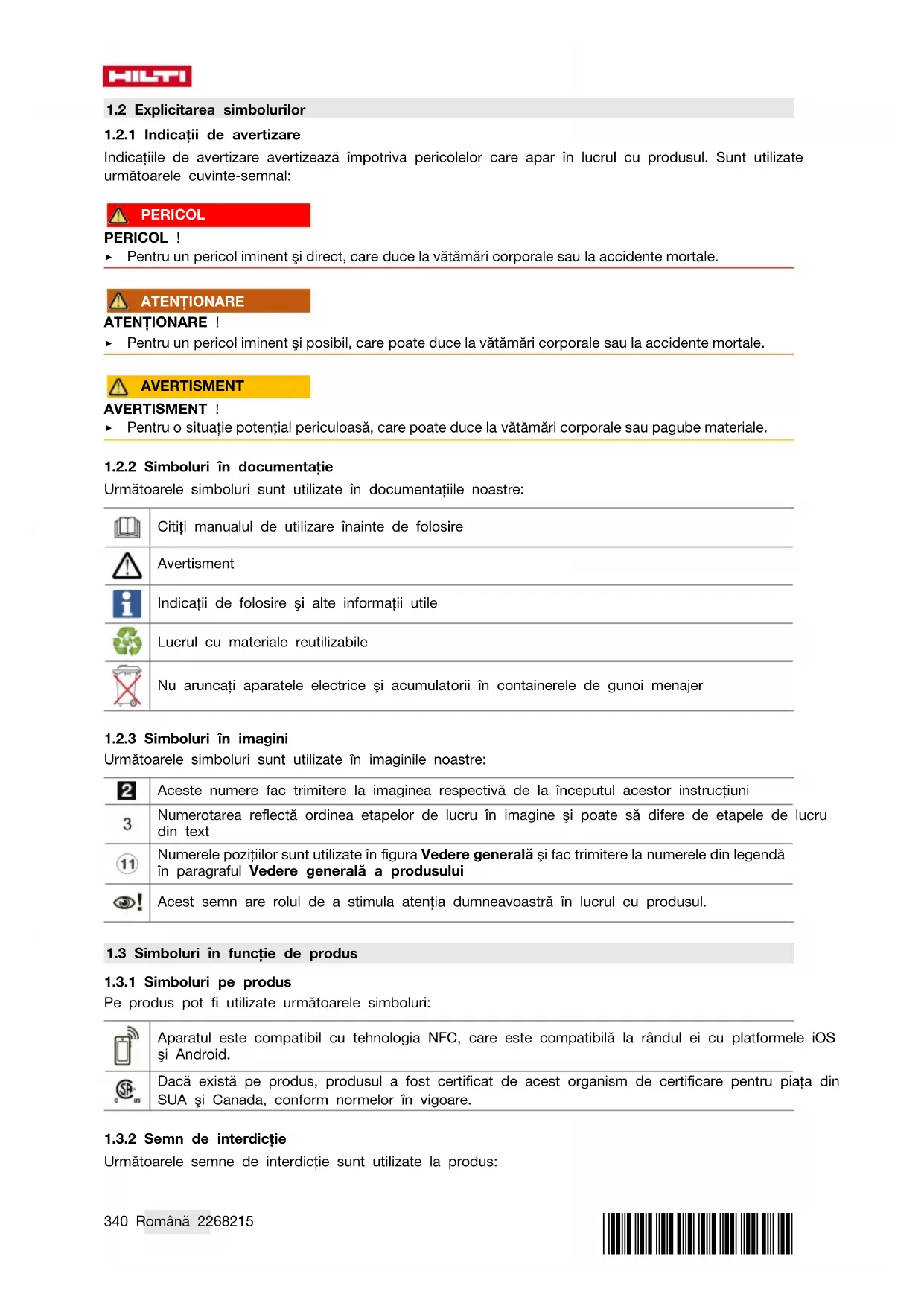 Declarăm pe propria răspundere că produsul descris aici este conform cu directivele şi normele în vigoare. O imagine a declaraţiei de conformitate găsiţi la finalul acestei documentaţii. Documentaţiile tehnice sunt stocate aici: Hilti Entwicklungsgesellschaft mbH | Zulassung Geräte | Hiltistraße 6 | 86916 Kaufering, DE342 Română 2268215 *2268215* 2 Securitate