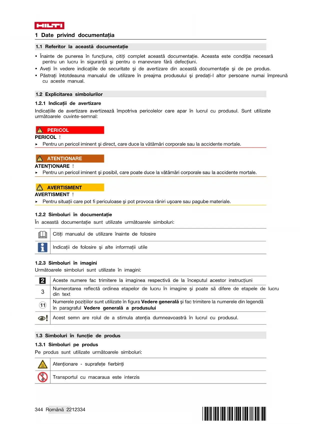 Declarăm pe propria răspundere că produsul descris aici este conform cu directivele şi normele în vigoare. O imagine a declaraţiei de conformitate găsiţi la finalul acestei documentaţii. Documentaţiile tehnice sunt stocate aici: Hilti Entwicklungsgesellschaft mbH | Zulassung Geräte | Hiltistraße 6 | 86916 Kaufering, DE 2 Securitate