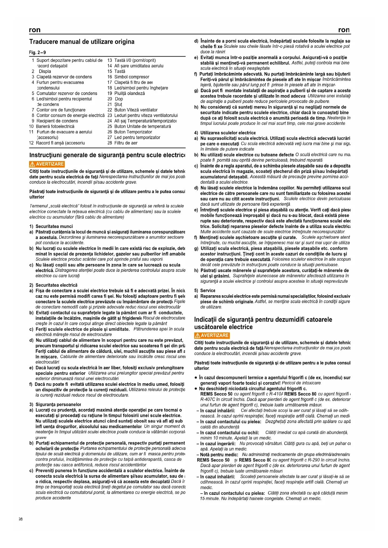 REMS Secco 80 cu agent frigorifi c R-290 în circuit închis. Dacă apar pierderi de agent frigorifi c (de ex. deteriorarea unui furtun de agent frigorifi c), trebuie luate următoarele măsuri: – în cazul inhalării: Scoateți persoanele afectate la aer curat și lăsați-le să se odihnească. În cazul opririi respirației, faceți respirație artifi cială. Chemați un Scoateți persoanele afectate la aer curat și lăsați-le să se odihnească. În cazul opririi respirației, faceți respirație artifi cială. Chemați un Scoateți persoanele afectate la aer curat și lăsați-le să se medic. – în cazul contactului cu pielea: Clătiți zona afectată cu apă călduță minim 15 minute. Nu îndepărtați hainele congelate. Chemați un medic. Fig. 2 – 9 1 Suport depozitare pentru cablul de racord detaşabil 2 Display 3 Clapetă rezervor de condens 4 Furtun pentru evacuarea condensului 5 Comutator rezervor de condens 6 Led/simbol pentru recipientul de condens 7 Contor ore de funcționare 8 Contor consum de energie electrică 9 Recipient de condens 10 Barieră fotoelectrică 11 Furtun de evacuare a aerului (accesoriu) 12 Racord fl anșă (accesoriu) 13 Tastă I/0 (pornit/oprit) 14 Afi șare umiditatea aerului 15 Tastă 16 Simbol compresor 17 Clapetă fi ltru de aer 18 Led/simbol pentru înghețare 19 Piuliță olandeză 20 Dop 21 Ștuț 22 Buton Viteză ventilator 23 Leduri pentru viteza ventilatorului 24 Afi șaj Temperatură/temporizator 25 Buton Unitate de temperatură 26 Buton Temporizator 27 Led pentru temporizator 28 Filtru de aer ron ron 98ron ron – în cazul contactului cu ochii: Clătiți imediat ochiul cu apă din abundență, protejând ochiul neafectat. Se vor scoate lentilele de contact, dacă se poate. Chemați imediat un medic. – Notă pentru medic / simptome posibile: Tulburări respiratorii, stare de narcoză, tratament simptomatic, monitorizarea circulației.