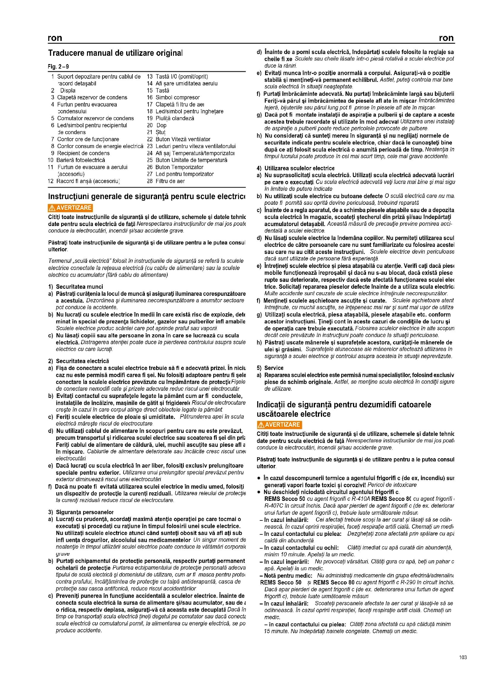 REMS Secco 80 cu agent frigorifi c R-290 în circuit închis. Dacă apar pierderi de agent frigorifi c (de ex. deteriorarea unui furtun de agent frigorifi c), trebuie luate următoarele măsuri: – în cazul inhalării: Scoateți persoanele afectate la aer curat și lăsați-le să se odihnească. În cazul opririi respirației, faceți respirație artifi cială. Chemați un Scoateți persoanele afectate la aer curat și lăsați-le să se odihnească. În cazul opririi respirației, faceți respirație artifi cială. Chemați un Scoateți persoanele afectate la aer curat și lăsați-le să se medic. – în cazul contactului cu pielea: Clătiți zona afectată cu apă călduță minim 15 minute. Nu îndepărtați hainele congelate. Chemați un medic. Fig. 2 – 9 1 Suport depozitare pentru cablul de racord detaşabil 2 Display 3 Clapetă rezervor de condens 4 Furtun pentru evacuarea condensului 5 Comutator rezervor de condens 6 Led/simbol pentru recipientul de condens 7 Contor ore de funcționare 8 Contor consum de energie electrică 9 Recipient de condens 10 Barieră fotoelectrică 11 Furtun de evacuare a aerului (accesoriu) 12 Racord fl anșă (accesoriu) 13 Tastă I/0 (pornit/oprit) 14 Afi șare umiditatea aerului 15 Tastă 16 Simbol compresor 17 Clapetă fi ltru de aer 18 Led/simbol pentru înghețare 19 Piuliță olandeză 20 Dop 21 Ștuț 22 Buton Viteză ventilator 23 Leduri pentru viteza ventilatorului 24 Afi șaj Temperatură/temporizator 25 Buton Unitate de temperatură 26 Buton Temporizator 27 Led pentru temporizator 28 Filtru de aer ron ron 103ron ron – în cazul contactului cu ochii: Clătiți imediat ochiul cu apă din abundență, protejând ochiul neafectat. Se vor scoate lentilele de contact, dacă se poate. Chemați imediat un medic. – Notă pentru medic / simptome posibile: Tulburări respiratorii, stare de narcoză, tratament simptomatic, monitorizarea circulației.