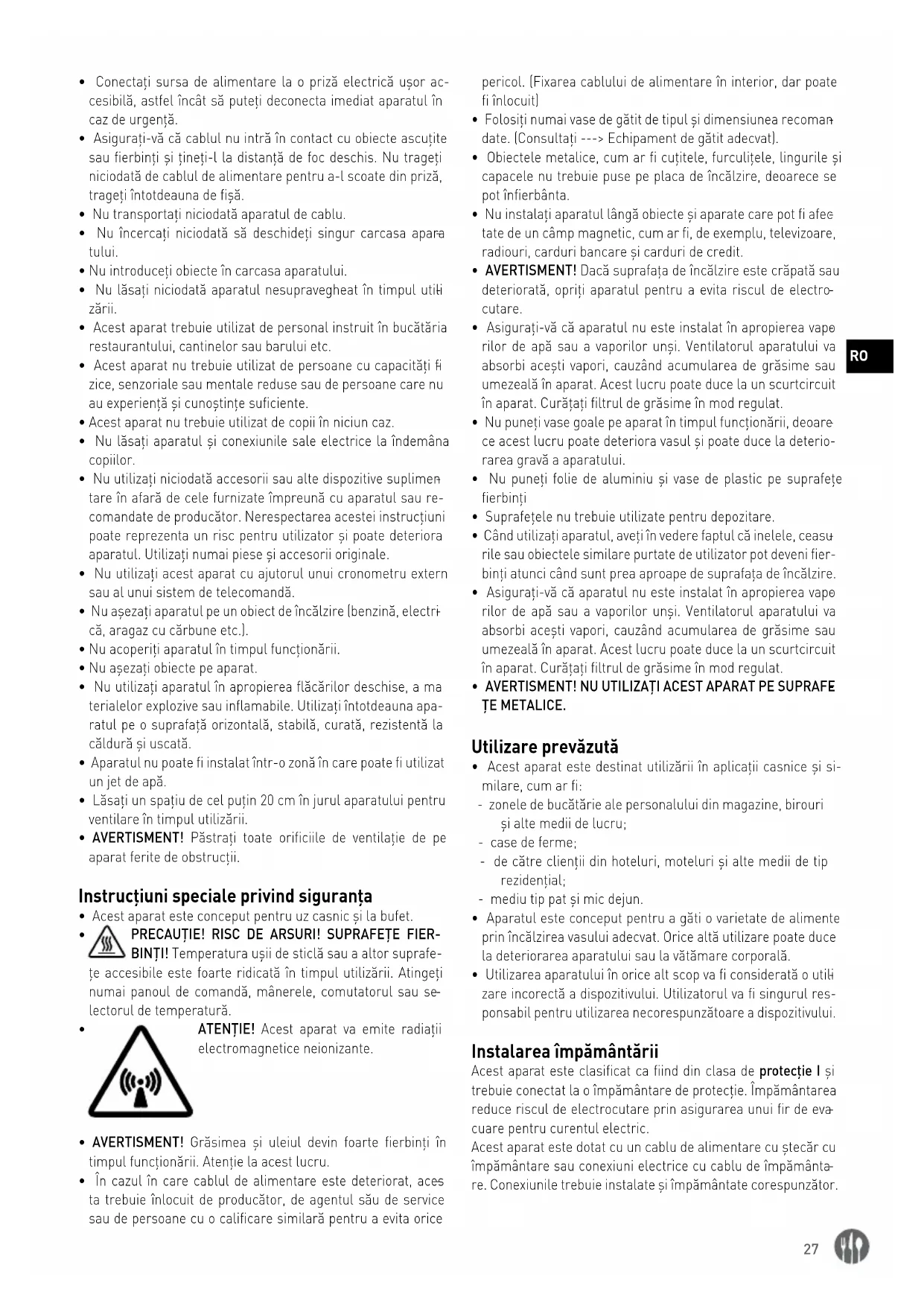 - Aparatul este conceput pentru a găti o varietate de alimente prin încălzirea vasului adecvat. Orice altă utilizare poate duce la deteriorarea aparatului sau la vătămare corporală.