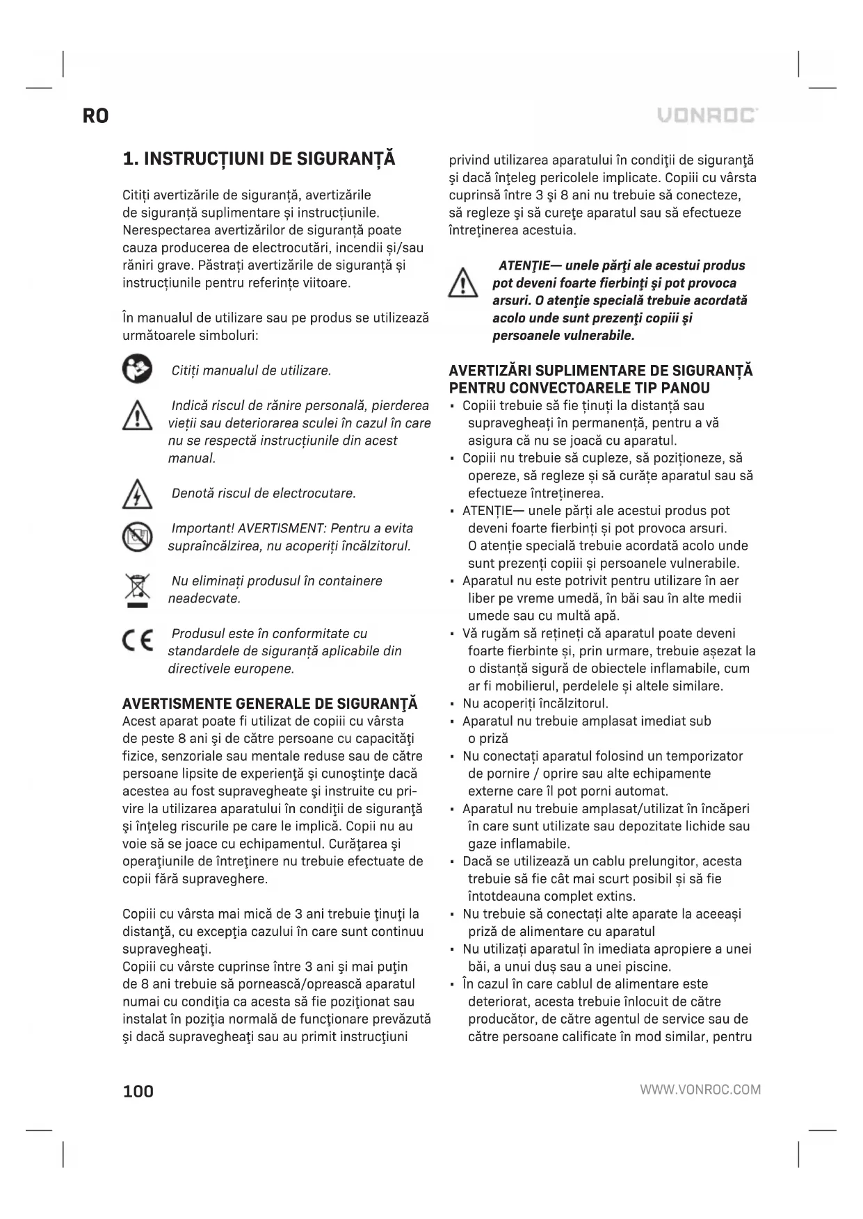 - Depozitaţi încălzitorul într-un spaţiu uscat, bine ventilat MEDIU Aparatele electrice sau electronice deteriorate şi/sau defecte trebuie colectate în locurile de reciclare corespunzătoare. Numai pentru ţările din CE Nu aruncaţi echipamentele acţionate electric împreună cu gunoiul menajer. Conform Indicaţiei europene 2012/19/EU pentru echipamente electrice şi electronice uzate şi aimplementării sale la nivel naţional, echipamentele acţionate electric scoase din uz trebuie colectate separat şi evacuate într-omani- eră ecologică. GARANŢIE Produsele VONROC sunt realizate la cele mai înalte standarde de calitate şi sunt garantate în privinţa materialelor şi amanoperei pentru întreaga perioa- dă de utilizare în garanţie, începând cu data achizi- ţiei. În cazul în care produsul prezintă defecţiuni în perioada de garanţie din cauza materialului defect şi/sau amanoperei, contactaţi direct VONROC.RO
